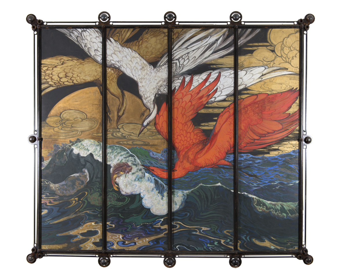 Fil rouge che accompagna il visitatore lungo tutto il percorso espositivo, l’acqua costituisce una nota costante in tutta la produzione di Chini e racconta la sintonia dell’artista con gli sfondi ora fluviali, ora marini, dall’Arno al fiume di Bangkok, da Venezia ai centri balneari e termali di Viareggio, Montecatini e Salsomaggiore. Non ne è esente neppure la produzione ceramica, l’ambito, tra i molteplici in cui Chini si espresse, che gli diede l’opportunità di entrare nel circuito internazionale e di imporsi fin dal 1898 tra i primi interpreti del Liberty in Italia: i soggetti della fauna marina sono protagonisti nella decorazione di vasi, piatti, formelle dove l’artista gareggia con la natura nella varietà delle composizioni e nella resa cromatica attraverso stupefacenti smalti a lustro.