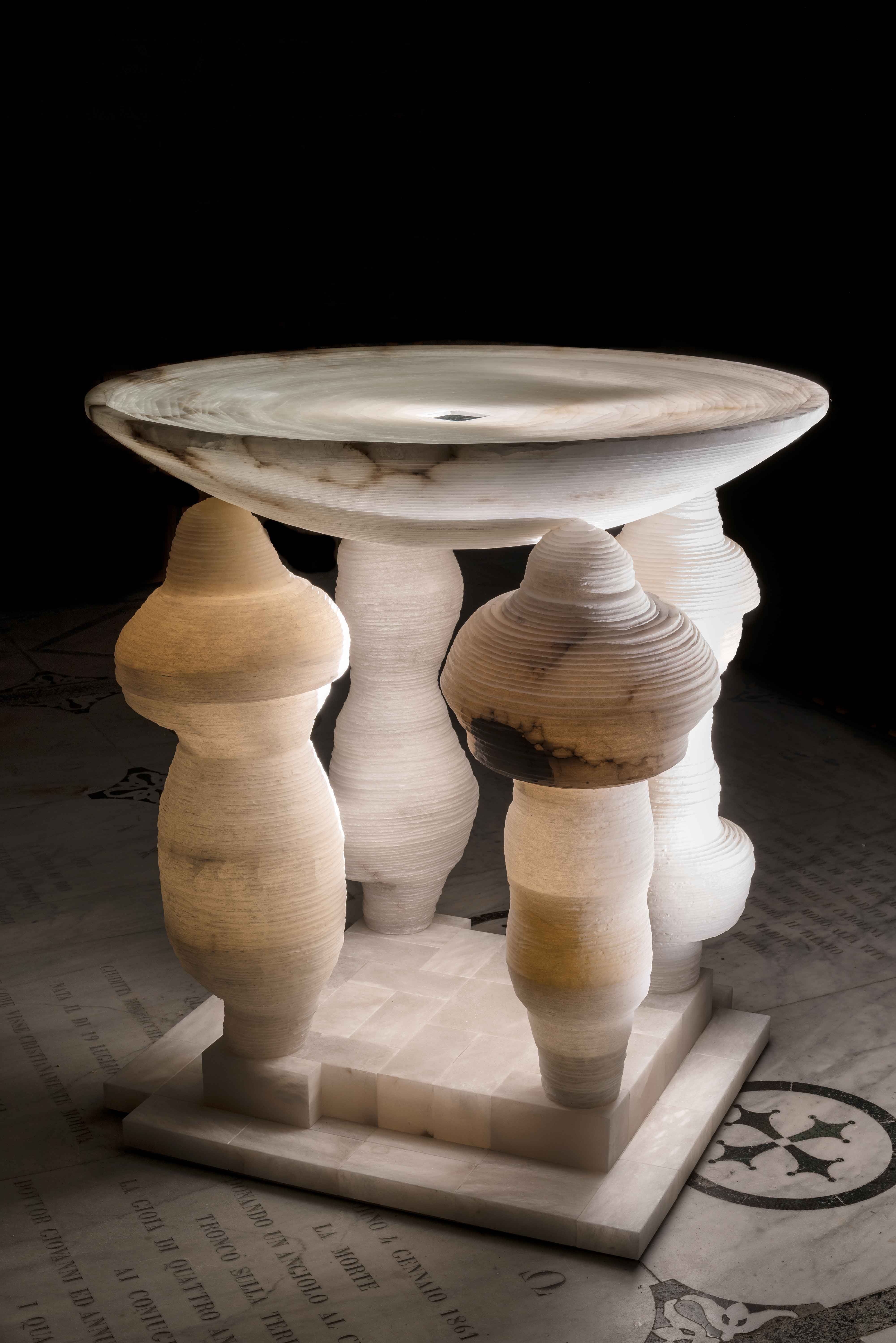 L’elemento Aria è evocato in Sonovasoro, vaso in alabastro e foglia d’oro, che contiene l’ombra della croce, posto dove la diagonale virtuale incrocia, sul finire del percorso, il vano della finestra dell’abside.