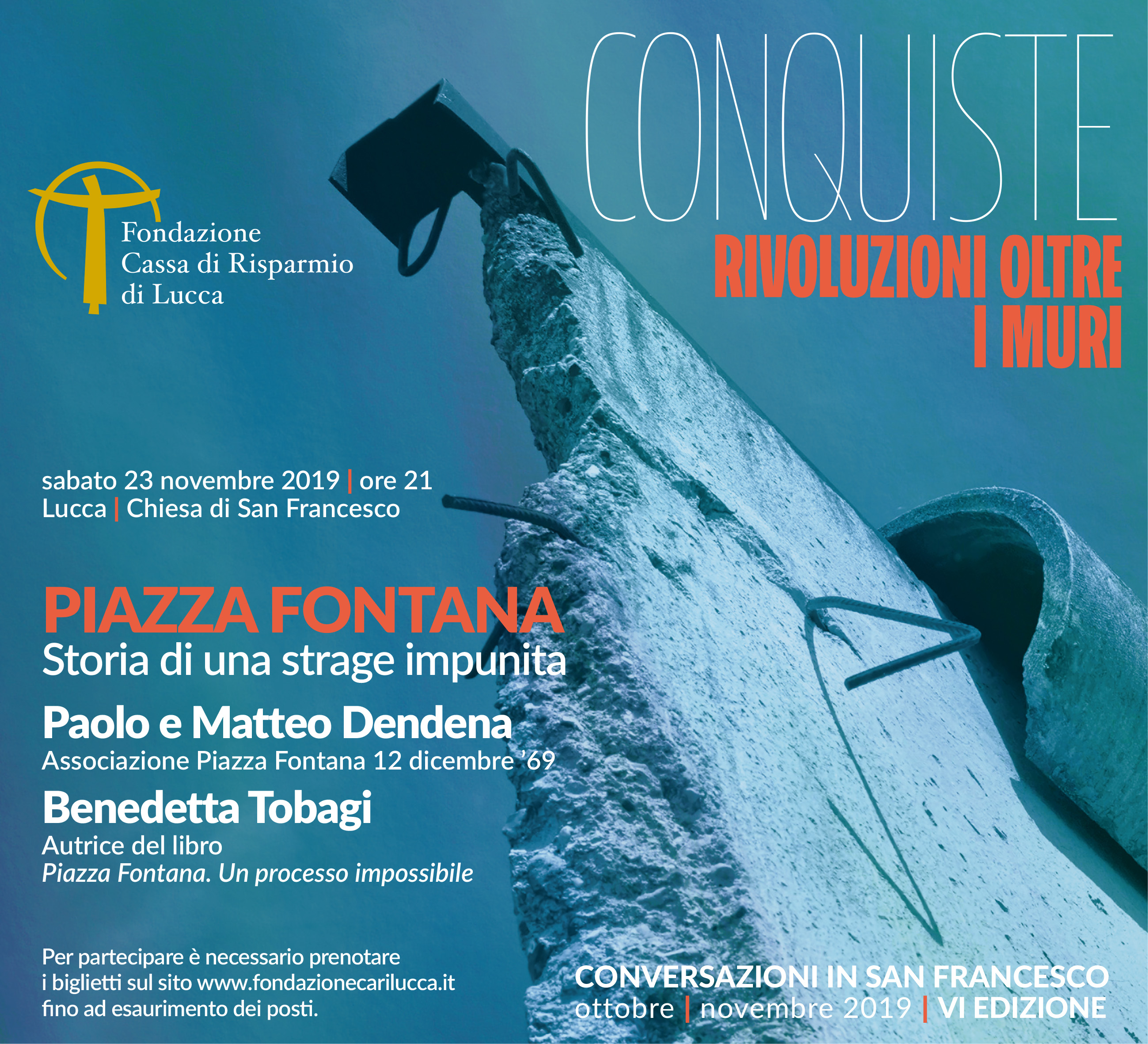 Era il 12 dicembre 1969 quando una bomba piazzata nella sala centrale della Banca Nazionale dell’Agricoltura, in Piazza Fontana a Milano, provocò una strage: 17 vittime e una novantina di feriti. Sono passati 50 anni da allora e ancora oggi, dopo un processo durato 36 anni, “il più lungo della storia repubblicana”, rimangono ignoti i nomi degli esecutori materiali. Le Conversazioni in San Francesco, ideate e organizzate dalla Fondazione Cassa di Risparmio di Lucca, dedicano l’appuntamento di sabato 23 novembre (ore 21), a quell’episodio, che ha segnato uno dei periodi più bui della storia italiana. Piazza Fontana. Storia di una strage impunita, questo il titolo della serata, vede la partecipazione di Benedetta Tobagi, autrice del libro Piazza Fontana. Il processo impossibile (Einaudi), e di Paolo e Matteo Dendena, rispettivamente figlio e nipote di una delle vittime, Pietro. Coordina l’incontro Piero Ceccatelli, caporedattore e responsabile Web de La Nazione.