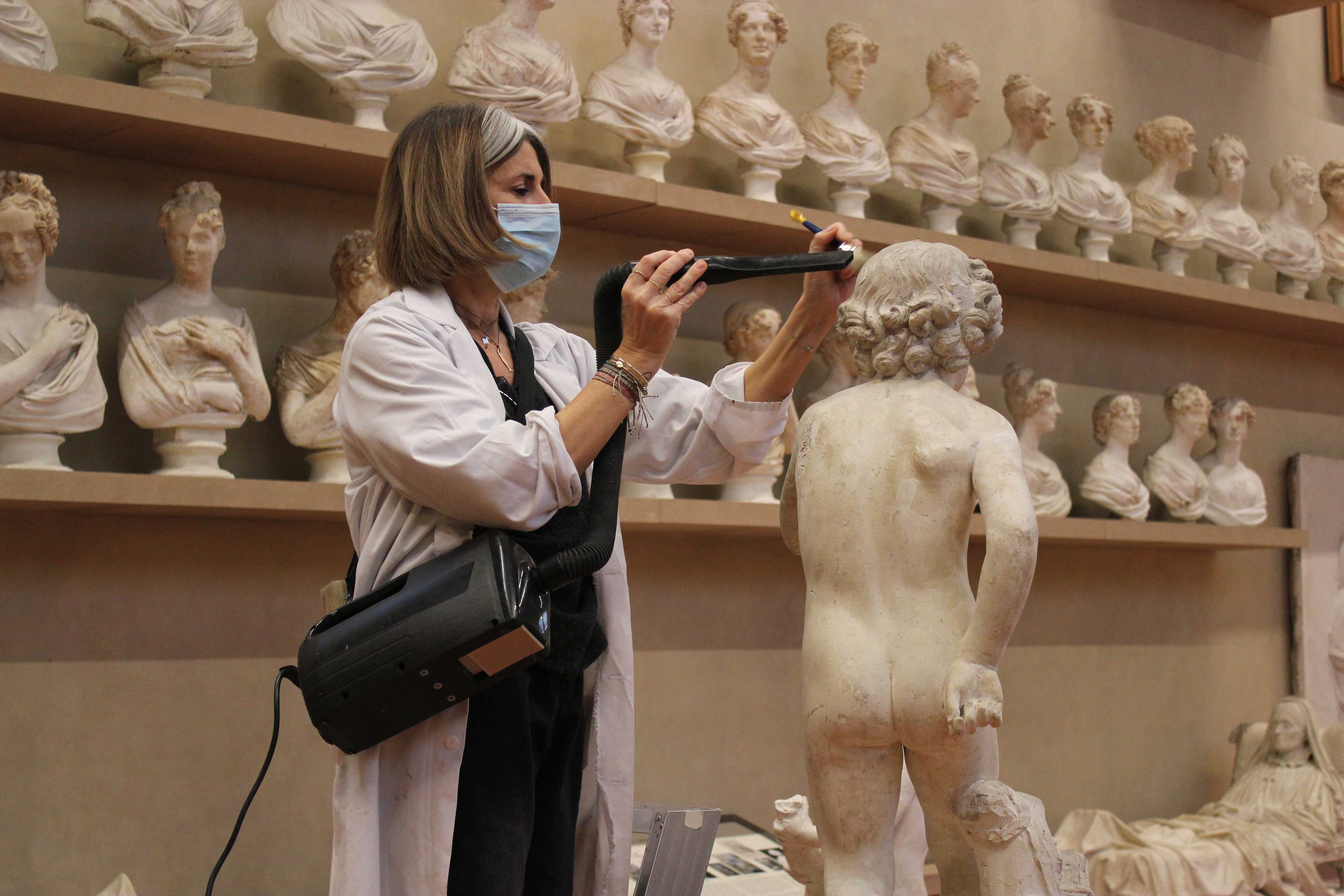 I lavori hanno necessariamente comportato la movimentazione delle opere contenute in questa sala. I 264 busti ritratti sono stati spostati dalle mensole che a vari livelli corrono lungo le pareti dell’ambiente e, insieme alle 60 sculture monumentali e i 40 bassorilievi, troveranno collocazione in altre aree della Galleria. Con l’occasione, è stata avviata un’accurata campagna fotografica, condotta da Antonio Quattrone, che permetterà di dotare il museo di un corredo digitale completo per la documentazione dell’opera dello scultore toscano. I gessi, inoltre, con il coordinamento della funzionaria restauratrice del museo e con il supporto di una restauratrice specializzata, sono stati sottoposti a un’attenta verifica dello stato di conservazione con alcuni interventi di stuccatura e, soprattutto, di manutenzione attraverso una spolveratura con l’ausilio di pennelli a setole morbide e di aspiratori ad hoc, che ha permesso di rimuovere depositi di polvere e sporcizia.