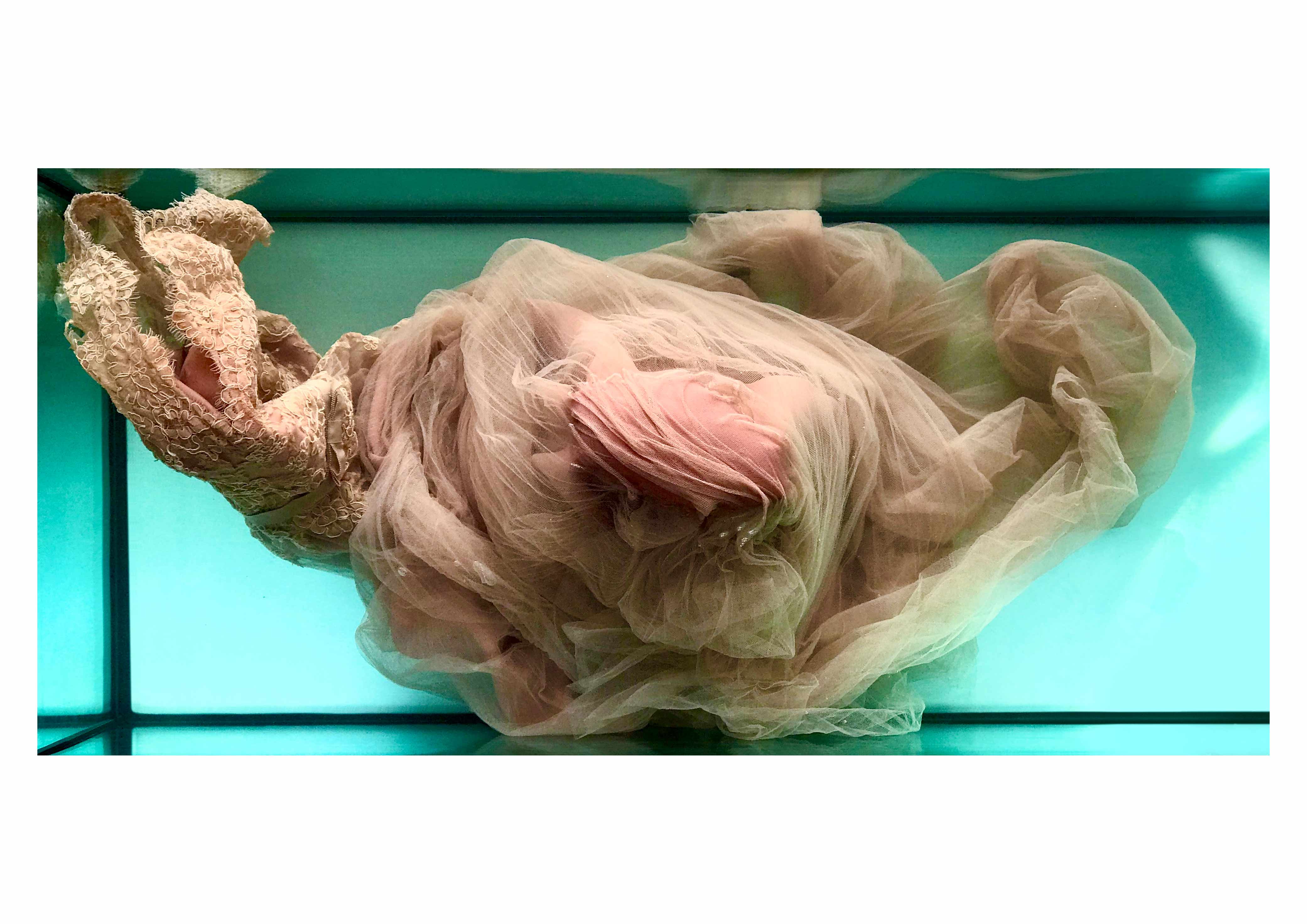 MUTAZIONI è frutto di un lavoro nato durante i mesi di lockdown forzato. È un lavoro fotografico che riflette sulla memoria, sulla storia individuale e famigliare, sui ricordi, a volte anche dolorosi, sulla catarsi che qui avviene attraverso l’azione purificatrice dell’acqua. All’interno di grandi teche di vetro, costruite dalla stessa Damerino, piene d’acqua, fluttuano degli abiti, abiti da sposa della sorella, i vestiti degli zii, del padre, brandelli di una narrazione privata ma allo stesso tempo parte di una storia universale. Raso, pizzo, sete, crepe de chine, chiffon, taffetà di organza, drappeggi che corrono il rischio di essere dimenticati ma che acquistano, attraverso il movimento fluido dell’acqua e della sua trasparenza, una nuova vita, carica di suggestioni che l’artista immortala nei suoi scatti. Le vesti sono figure mute, sospese nel tempo, che ritrovano colore, che si muovono, in solitudine o in coppia, in modo assolutamente autonomo dai corpi che li hanno abitati, quasi fosse una danza. Sono messaggi in una bottiglia, poesie galleggianti, memorie abbandonate.