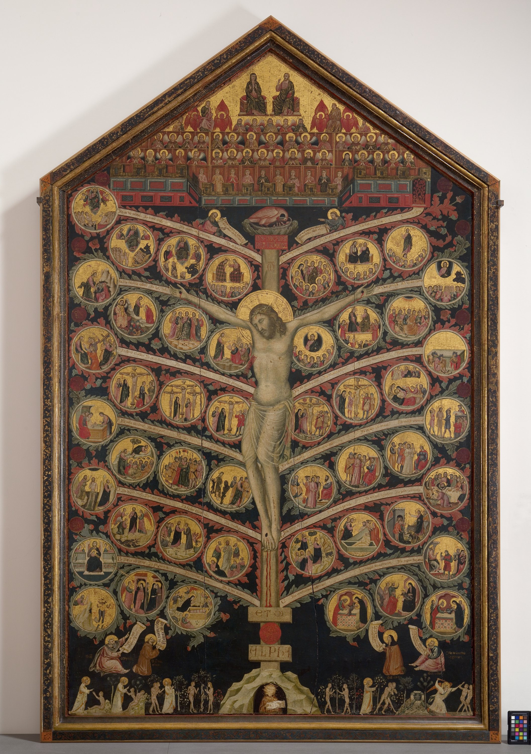 L’Albero della Vita è una tavola (tempera e oro) attribuita a Pacino di Buonaguida, datata intorno al 1310-1315. Traduce per immagini, in modo insolitamente dettagliato, i temi del testo letterario Lignum vitae, trattato scritto da san Bonaventura da Bagnoreggio, nel 1274. Al centro si trova la figura di Cristo, crocifissa a un albero con dodici rami, ad ognuno sono appesi quattro medaglioni con episodi della vita di Gesù; l’ultimo, in alto a destra, ne ha solo tre perché la scena finale è rappresentata nella sommità cuspidata del dipinto, dove il Redentore e La Vergine in trono sovrastano la schiera di santi, angeli e beati. In basso troviamo le storie della Genesi, mentre, sul registro appena superiore, a sinistra, le storie di Mosè e San Francesco, e, a destra, quelle della Santa Chiara e San Giovanni Evangelista. L’albero si erge sopra una roccia, al cui interno c’è una caverna nella quale scorgiamo un francescano con un libro aperto in mano, si tratta con buona probabilità dell’autore del testo, san Bonaventura. Come ha sottolineato, a suo tempo, la studiosa Maria Ciardi Duprè Dal Poggetto, sarebbe una delle raffigurazioni più antiche dei temi teologici-filosofici della corrente spirituale dell’ordine.
