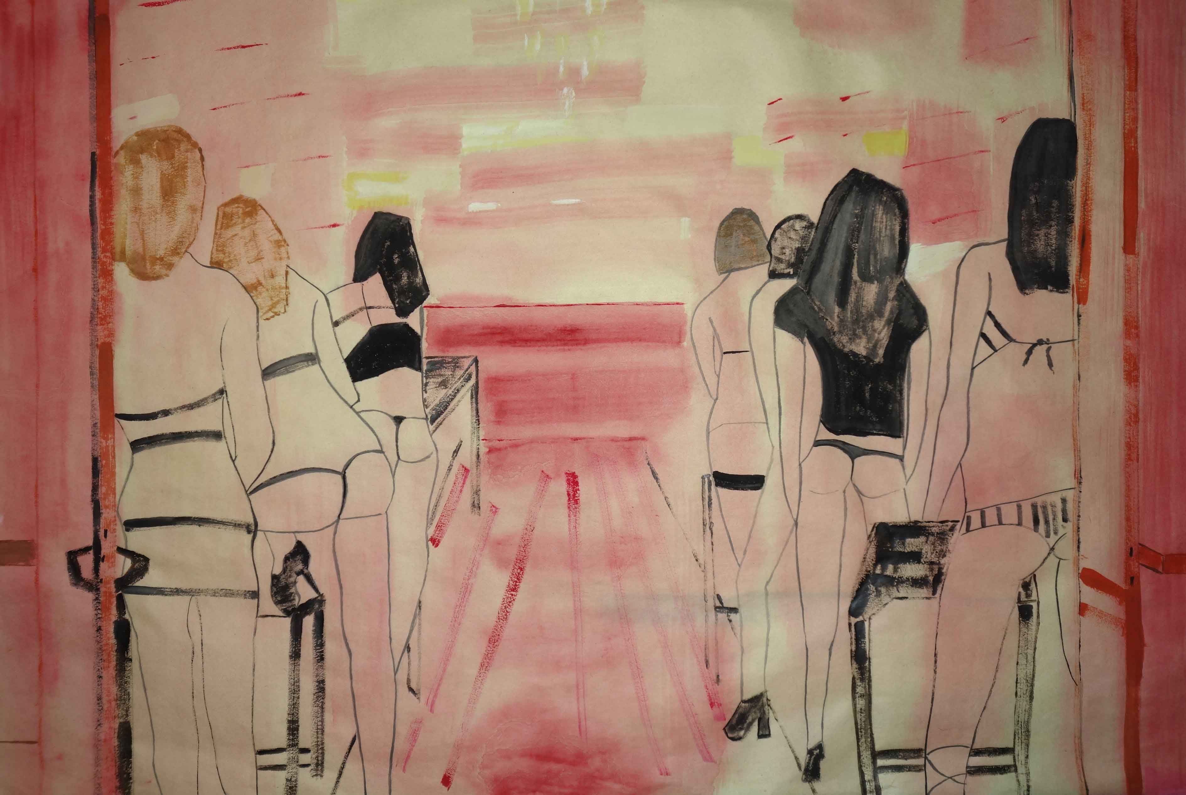 Le sue opere sono come dei fermoimmagine che ci invitano a riflettere. C’è la storia de La bambina, appoggiata a una porta socchiusa, dove aleggia quell’innocenza dell’infanzia non ancora intaccata dalla crudeltà della vita. Ci sono le donne sedute al margine della strada in attesa, in Pausa oppure la sola sedia vuota a dominare in modo emblematico la scena. Ci sono le Nigeriane che camminano di spalle sullo sfondo di un cielo livido. C’è uno sguardo sugli Anni Trenta con tre donne in guepierre e seno nudo che nella posa ricordano l’intrecciarsi di molte raffigurazioni delle Tre Grazie, dei dipinti antichi. E ancora ALL YOU CAN FUCK, di grandi dimensioni, in cui in un’aula dai toni sul rosso si raccolgono mezze nude una serie di ragazze, quasi sui banchi di una chiesa, pronte a iniziare la nottata.