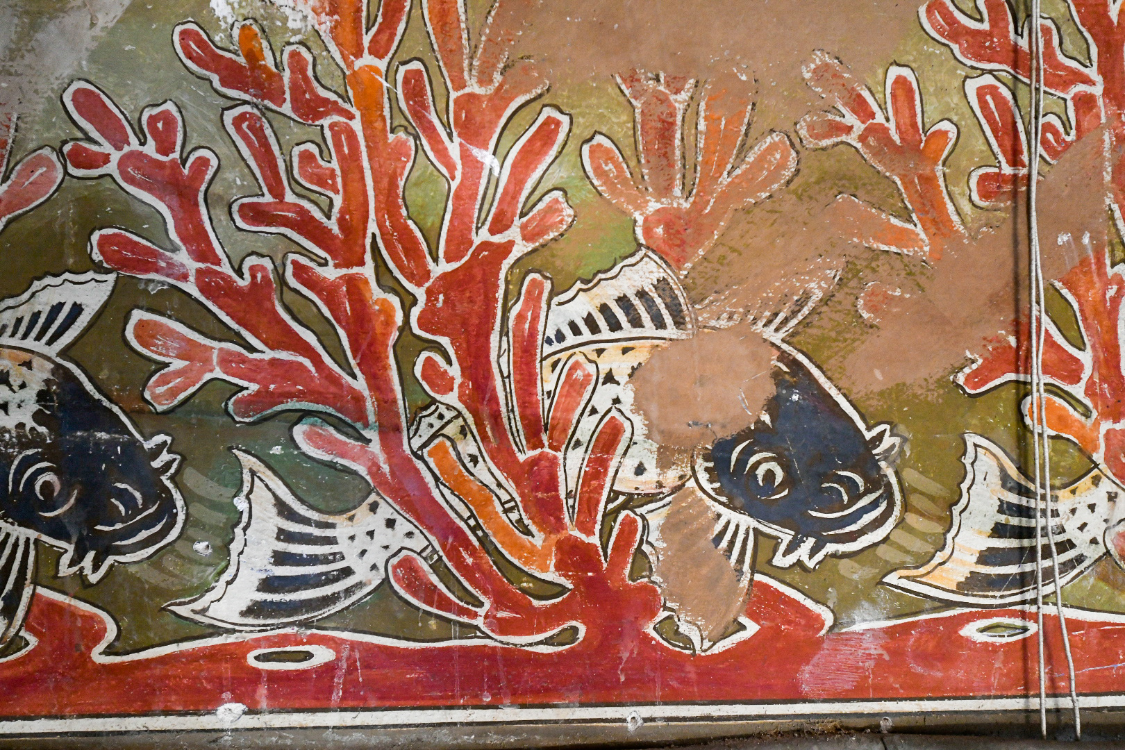 Le decorazioni si trovano nella fascia tra il soffitto a cassettoni e le finestre e si suppone, almeno da questo primo ritrovamento, che girino su tutti i lati della stanza. Vi sono raffigurati dei soggetti marini che si ripetono: sul fondo verde oliva, spiccano dei coralli dalla vivace colorazione rosso mattone e delle carpe dal corpo bianco puntinato e il muso scuro. Una pittura che rispecchia il gusto di Puccini per i temi legati al Giappone e che ricorda soggetti trattati dall’amico Galileo Chini e che possiamo vedere su alcuni dei suoi vasi o ceramiche.