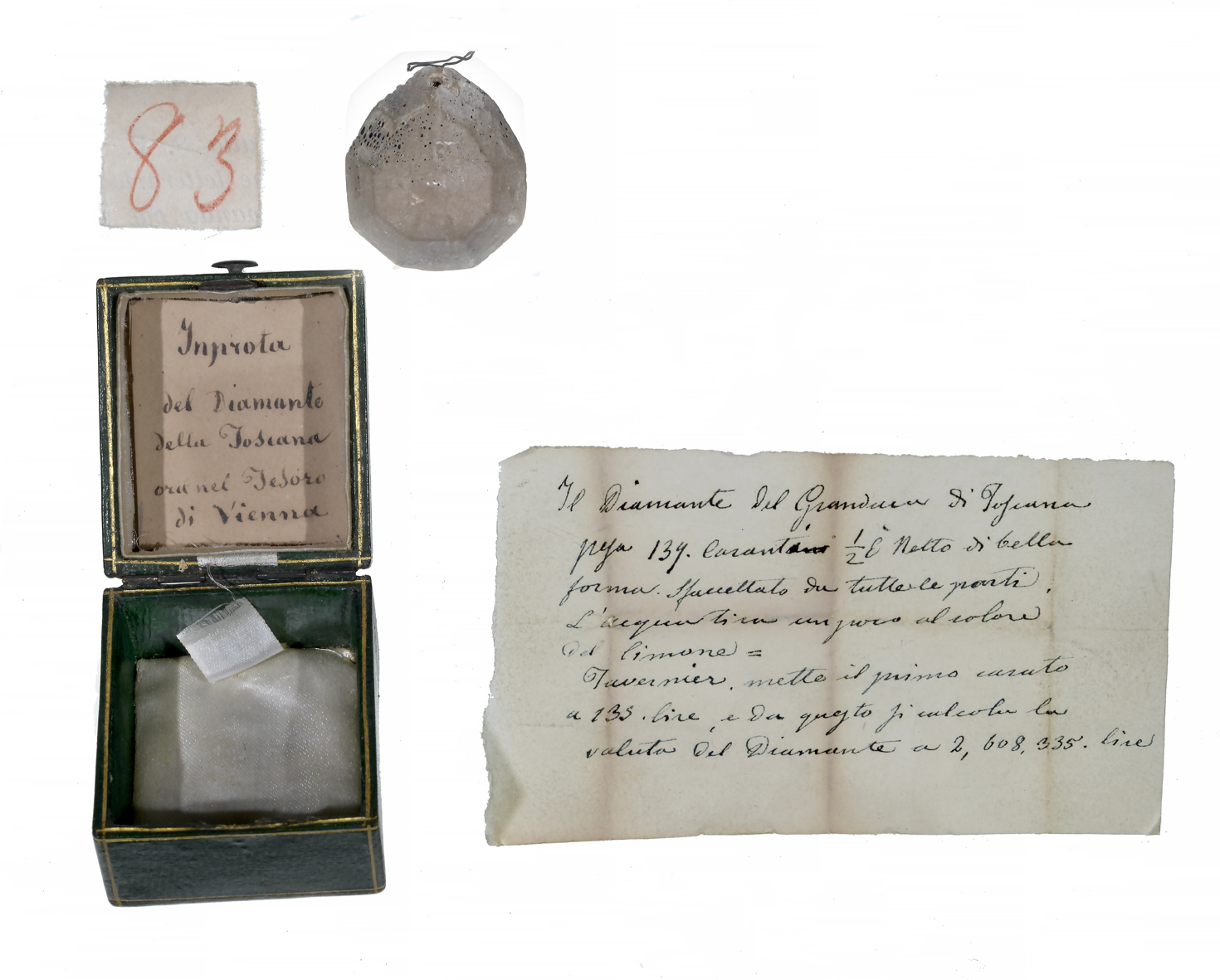 Il calco, facente parte del Monetiere del Museo Archeologico, in cui nel 1895 confluirono la collezione numismatica e quella glittica provenienti dalle Gallerie degli Uffizi, è conservato in una piccola scatola in pelle da gioielliere. Verosimilmente in gesso patinato, il calco del diamante è accompagnato da note manoscritte, una delle quali, sul coperchio del contenitore, identifica l’oggetto come impronta del Gran Diamante di Toscana, mentre la seconda, in un biglietto a parte, riporta il peso in carati, il valore in lire e la descrizione del colore della pietra.