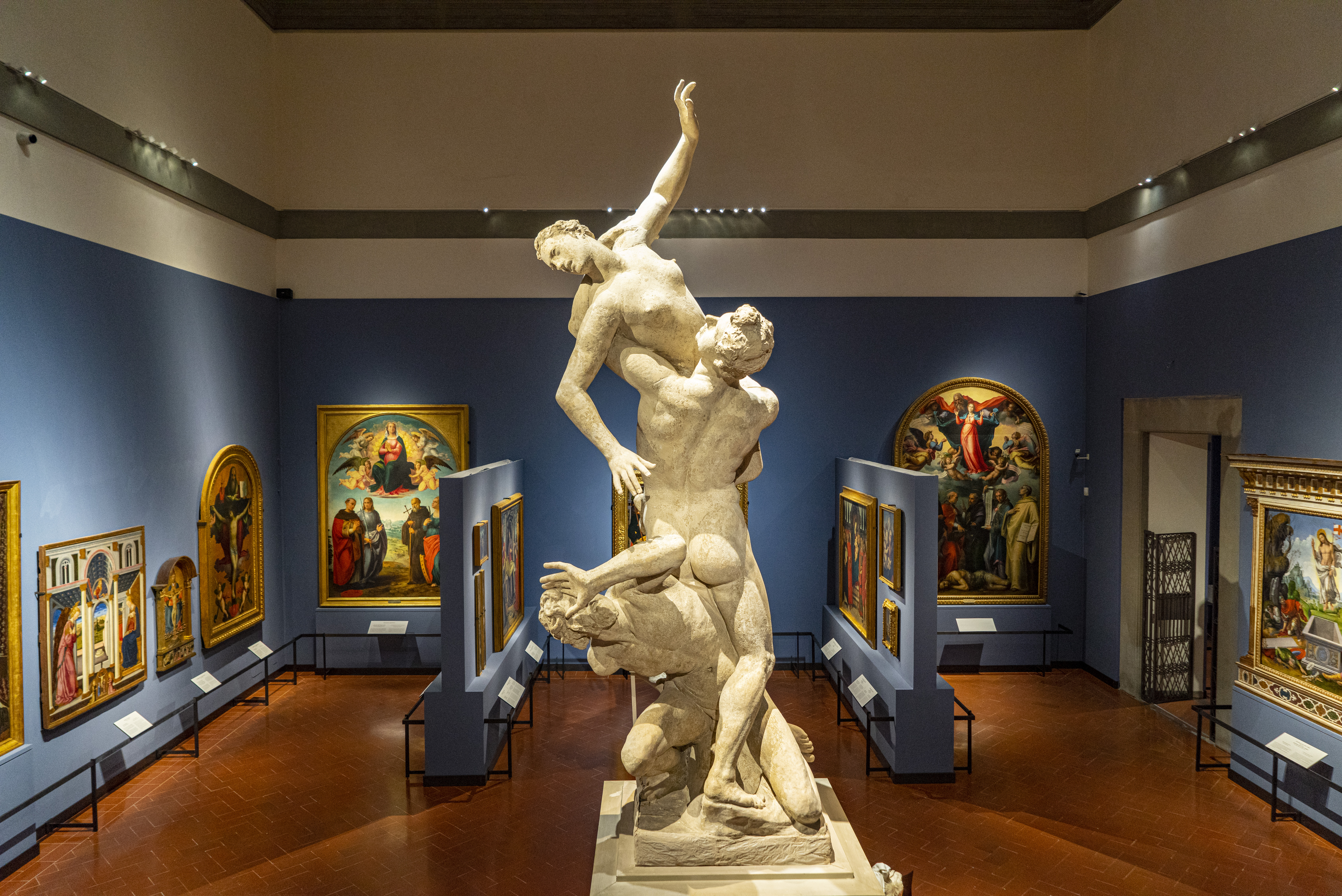 A parte tre opere di difficile movimentazione, per dimensioni e per fragilità, che sono dovute necessariamente rimanere in loco, protette nel modo più accurato ed efficace da strutture progettate e realizzate ad hoc – il gruppo scultoreo del Ratto delle Sabine, la grande pala dell’Assunzione della Vergine di Pietro Perugino e la Disputa dei Padri della Chiesa sull’Immacolata Concezione di Giovanni Antonio Sogliani – tutte le altre sono state messe in sicurezza e trasferite negli ambienti normalmente dedicati alle esposizioni temporanee, per consentire la loro visione al pubblico.