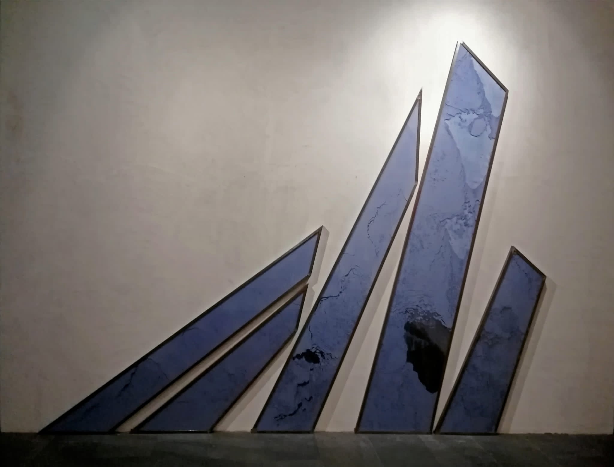Sophie Ko costruisce, invece, mappe cromatiche informi usando pigmenti puri, ceneri ottenute bruciando immagini di opere d’arte che raccolte in teche di vetro, poste verticalmente, si modificano con lo scorrere del tempo come in Geografie Temporali. Atti di Resistenza o Geografie temporali. Le Ceneri della Storia 2020. La posizione verticale fa sì che la gravità spinga la materia verso terra, la fa precipitare e, in questo senso, ogni Geografia temporale è un segnatempo, un orologio a polvere. La cornice delimita lo spazio dell’immagine di cenere, come le ampolle della clessidra definiscono lo spazio del tempo misurabile. Il disegno nel quadro cambia, le immagini vivono nel tempo, ne sono testimoni, scompaiono e ritornano. A volte Sophie Ko inserisce elementi come fiori o farfalle, Geografie Temporali. Vanitas della Terra, 2020, richiamando l’aspirazione metafisica, attraverso cangiantismi e sfavillii dorati, degli antichi maestri.