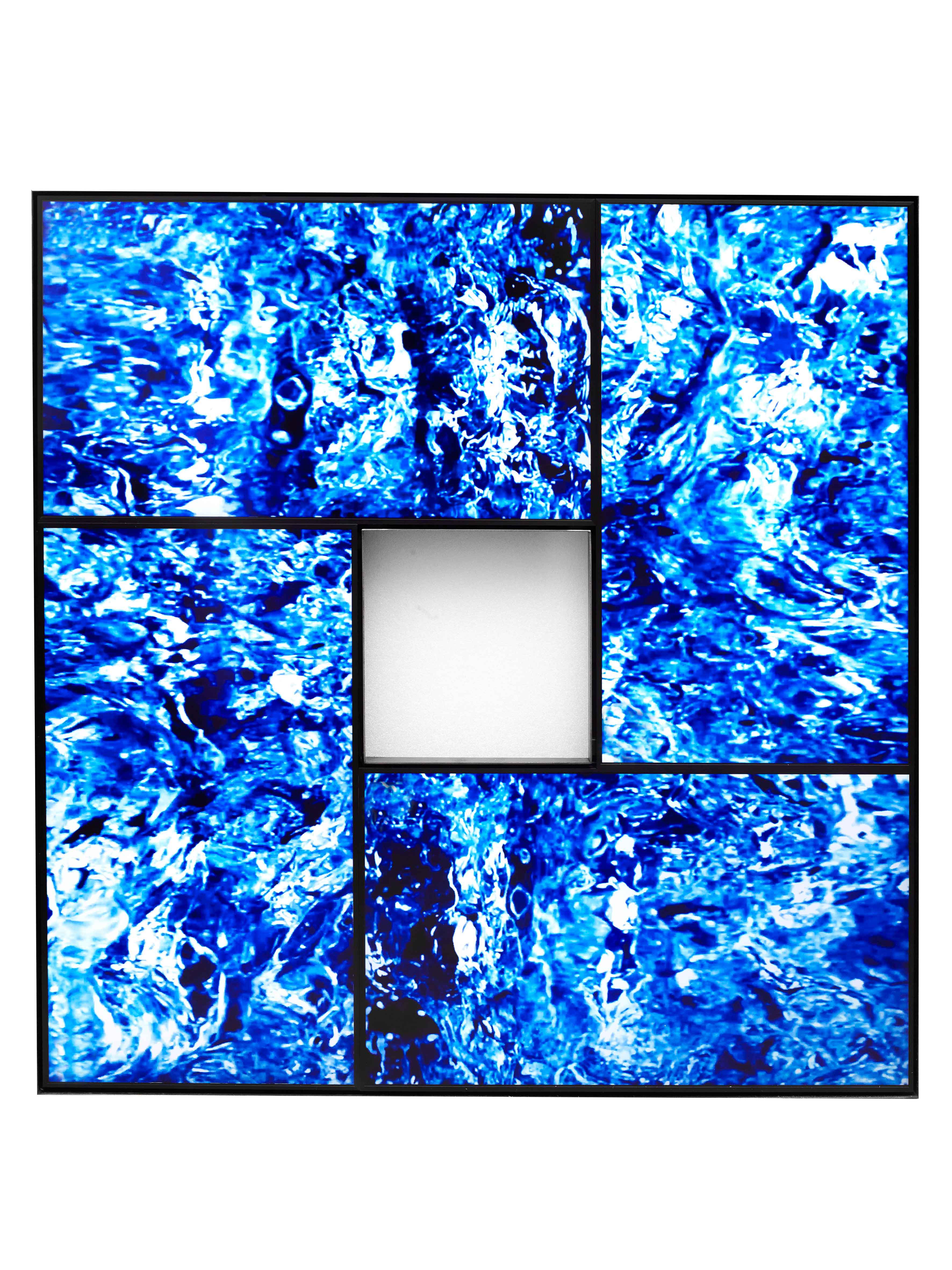 Al piano inferiore, la mostra prosegue con i lavori video più recenti, divisi per temi, in una sequenza che restituisce agli spettatori l’essenza degli elementi ritratti: dalla fluidità e la forza dell’acqua che scorre e travalica i perimetri tangibili dell’opera, al bagliore dei lampi che illuminano brevemente il buio della notte, all’incandescenza del fuoco che si manifesta anche nella striscia segnata dal passaggio della lava. A queste installazioni, connotate di un carattere di “meraviglia”, si aggiungono anche quelle regali delle “Cascate d’oro”, visioni che recuperano la preziosità dell’arte antica, così come la serie “Mosaico”, dove la tradizione artistica della tecnica a tasselli dorati acquista una resa visiva estremamente contemporanea. Plessi usa la tecnologia come materia da plasmare, così come uno scultore farebbe con il marmo. Non si ferma alla mera riproduzione dell’immagine o documentazione della realtà ma, come sottolineava Achille Bonito Oliva, “gioca con tematiche complesse come il rispecchiamento ed il doppio, il narciso e la memoria, con la produzione di immagini sofisticate capaci di evocare per il loro virtuosismo la “sprezzatura” manierista.”