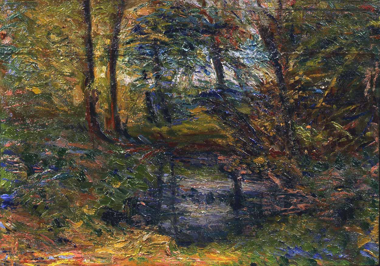 Nella sede fiorentina, prima tappa di questo percorso, al primo piano, potremo immergerci nell’arte figurativa del primo Novecento, con una nuova e suggestiva sala dalle pareti nere che accoglie alcune delle opere più emblematiche di questo periodo. Dipinti che pongono l’attenzione verso la rappresentazione del paesaggio, come Paysage che Pierre Auguste Renoir ha realizzato nel 1919, oppure uno straordinario Impressioni di paesaggio, di qualche anno prima, del 1908, di Umbero Boccioni, un soggetto en plein air, dall’atmosfera luminosa e satura di colori. Questo tema ritorna in un nucleo degli anni Trenta, a cominciare dal Giardino dell’oblio, dove Galileo Chini nel 1933 raffigura, con un velo di malinconia, la casa nella pineta viareggina di Eleonora Duse, villino nel quale l’attrice si era ritirata dopo la fine della sua storia d’amore con Gabriele D’Annunzio. Un particolare curioso distingue questo quadro: sul retro Chini annota parole, allude al dramma dell’amore finito, evoca nomi senza citarli, ed infine disegna una planimetria di strade dove colloca la propria abitazione e quelle dei pittori Viani, Chini e Nomellini. Anche in Paese (Paesaggio con albero), del 1935, un altro dei maestri toscani, Ottone Rosai, presente in questa antologica con più opere, mette in relazione la natura, l’albero nello specifico, con elementi come le case, con la solida essenzialità che lo contraddistingue. Uno sguardo sugli interni, sulla narrazione domestica, viene interpretato in modo assai diverso da Plinio Nomellini e Alberto Savinio, rispettivamente in Interni con natura morta, 1938, e Les Prisonniers, IIème version, 1931. Tra i massimi esponenti del Futurismo, abbiamo anche Giacomo Balla con due opere, firmate FUTUR BALLA, di cui segnaliamo Balfiore, 1925 circa.