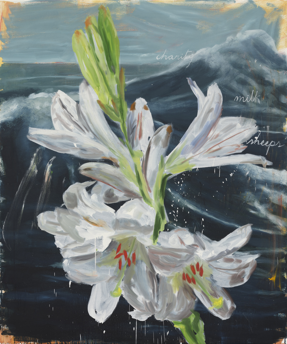 “Su superfici relativamente grandi, – spiega Giorgio Verzotti nel testo che accompagna la mostra – l’artista dipinge immagini di fiori su sfondi marini: fiori selvatici o da giardino, malvarosa, luminosi narcisi gialli o gigli, girasoli e protee, delineati con attenzione ai dettagli, come si farebbe per un ritratto, ma con una pittura mossa, gocciolante, quasi impetuosa nel definire le onde. L’associazione fra i fiori e il mare ha un valore simbolico, entrambi alludono a ciò che è transeunte, che trascorre, all’effimero. Questi elementi naturali diventano emblemi del divenire e sembra che l’artista li dipinga in grandi dimensioni per poterli fermare, mentre l’agitazione della pittura ne annuncia il destino di provvisorietà.”