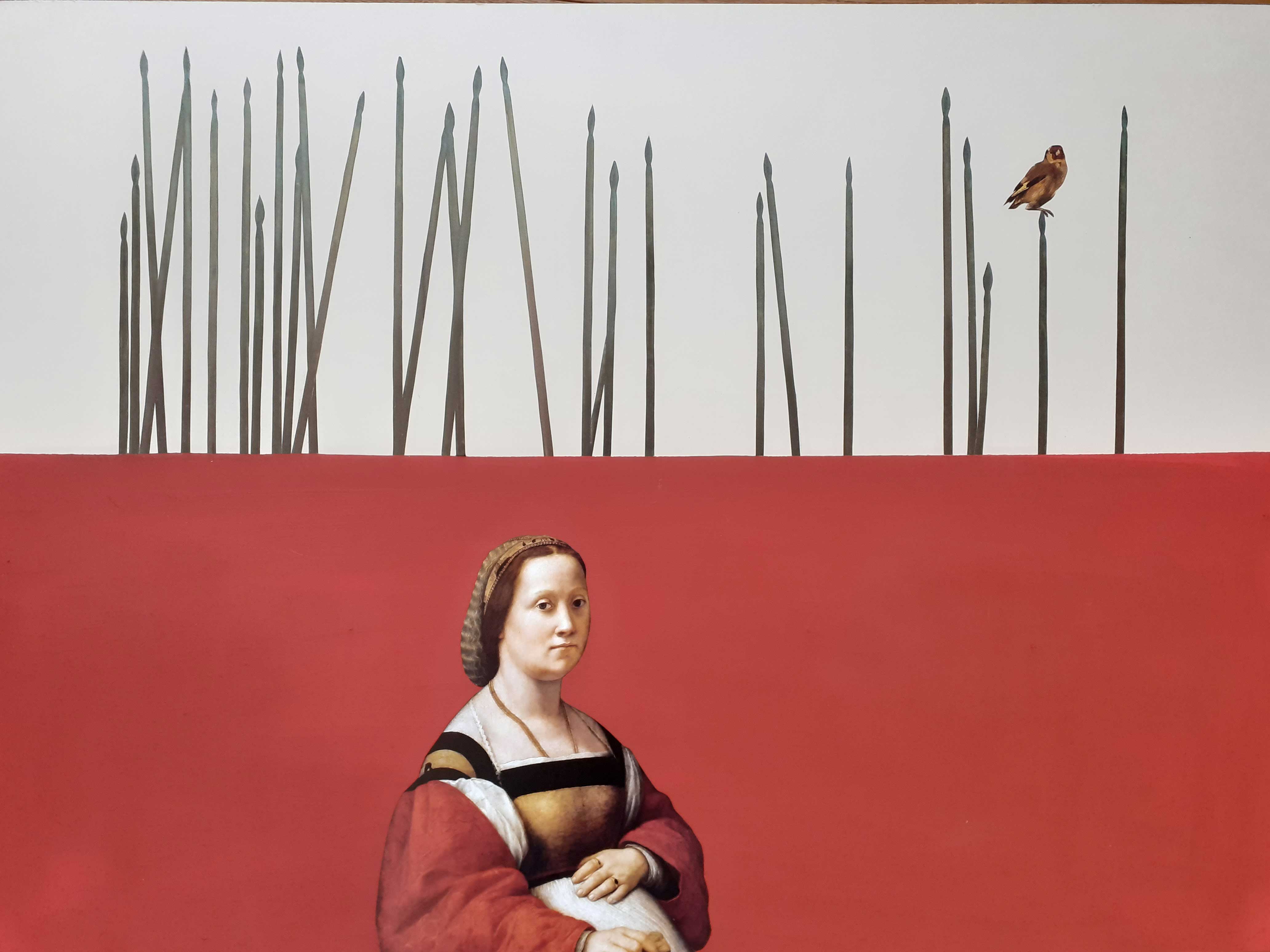 Cecilia Cosci, artista fiorentina, lavora da alcuni anni alla costruzione di montage, con personaggi e immagini, ritagliati da opere pittoriche acquisite dalla storia dell’arte, dal Trecento al Novecento, e riformulati in nuove composizioni. I personaggi che individua dall’immaginario antico, si rinnovano in un nuovo contesto, perdono la loro funzione originaria e si animano di un significato altro, a cui sottende sempre l’elemento dell’ironia. Forbici, colla, carta e cartone, acrilico sono gli strumenti che la Cosci usa, spesso di notte, in compagnia della musica che funge da colonna sonora alla sua personale riscrittura di questa narrazione contemporanea. “Generalmente non penso a niente mentre costruisco l’opera, ma sono molto concentrata” racconta l’artista. “Sono completamente rapita, perdo il senso del tempo. Non fumo, non sento la stanchezza, non mi riposo. Finché non ho finito, non riesco a staccare. A volte è una sofferenza, mi viene un gran mal di testa, mi svuoto completamente e dopo mi viene una fame terribile. Quando scelgo un’immagine, capita di trovarle subito una collocazione o un significato in relazione ad altre, a volte invece mi capita di tenerla da parte a decantare. Se sento che non arrivo a nulla, smetto, ci torno in un secondo tempo. Certe figure mi assillano per giorni, o mesi, fino a quando non cambio la loro posizione o funzione, per dar loro una seconda vita.”