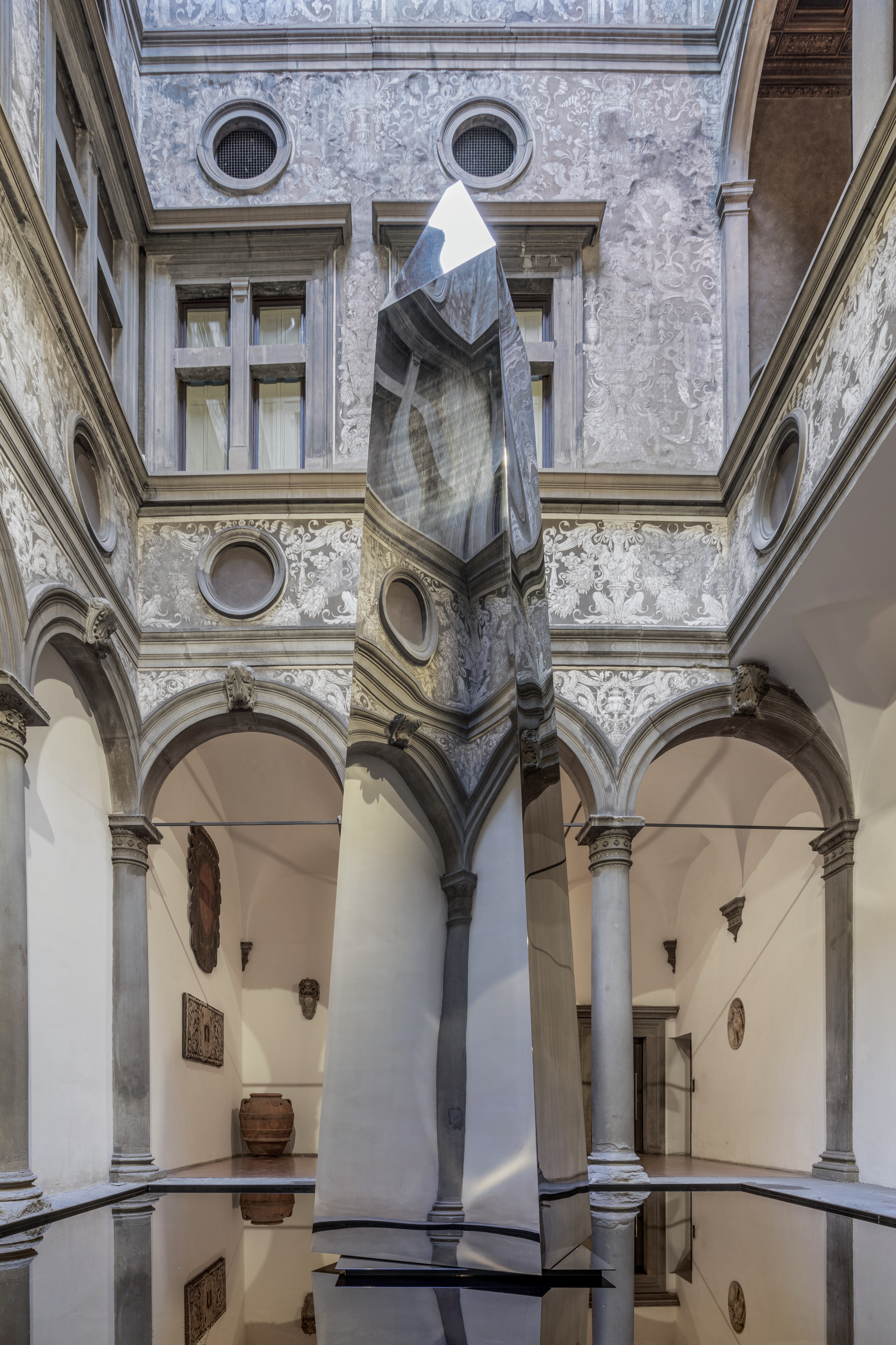 Nella corte rinascimentale del palazzo, racchiuso dalle geometrie perfette delle sue linee architettoniche, si ergerà, fino all’altezza delle prime arcate, un obelisco puntato verso il cielo, sospeso sopra uno specchio d’acqua. La superficie dell’obelisco, fatta di una lamina d’acciaio altamente tecnologica, rifletterà tutto quello che lo circonda, cambiando lentamente prospettiva, grazie al suo movimento rotatorio. Felice Limosani, artista che fa della formazione multidisciplinare la sua forza, ha ideato Pezzi di Pace su commissione di Roberto Casamonti, un lavoro dove ogni limite concettuale e fisico viene assottigliato a favore di un’armonia visiva che integra e fa dialogare e accordare tutti gli elementi coinvolti; un’opera metafisica che crea un rapporto magnetico e di totale adesione con lo spettatore, accogliendolo fisicamente in un solenne canone ideale. Limosani ci invita a riflettere sul momento attuale, sul desiderio collettivo di Pace, condizione ambita ma costantemente disattesa per l’incapacità di sedare i conflitti, per la negazione dei diritti, a causa delle tensioni religiose ed etniche, e dei disastri ambientali. Pezzi di Pace, nell’intenzione dell’autore, è un segno, non ha niente di politico, siamo tutti chiamati a contribuire con un pezzetto alla pace attraverso la cultura, la conoscenza, l’educazione, la gentilezza, il rispetto reciproco, valori fondamentali alla sua realizzazione e l’arte è un mezzo. Non a caso, l’artista, ha scelto una forma antica, per questa narrazione, una forma che ripercorre la Storia, come quando l’esercito di Roma occupò l’Egitto e si portò via l’obelisco di Heliopolis, caro agli egizi, come ben descrive Sonia Zampini nel saggio critico che accompagna l’esposizione. In quel caso fu sottratto qualcosa che, oltre a testimoniare la conquista, rappresentava l’identità culturale di quel luogo con tutte le implicazioni legate alla simbologia mitologica che rappresentava. Pezzi di Pace è un ideale congiungimento tra cielo e terra, tra dimensione umana e luogo delle idee; è un desiderio di completare e mettere in equilibrio gli opposti: noi e il mondo, noi e gli altri.