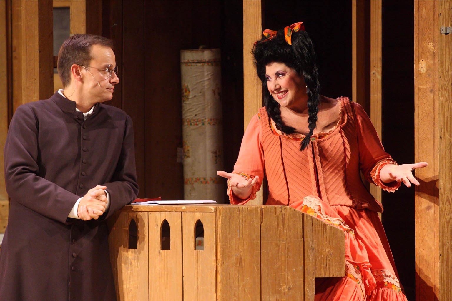 Spettacolo unico e particolarissimo trova il suo successo, oltre che nelle invenzioni del testo e delle musiche, nella perfetta macchina teatrale inventata da Giulio Coltellacci che firmò scene e costumi. La canonica, la piazza con il sagrato, l’Arca si succedono in maniera continua grazie ai due girevoli che danno vita a cambiscena che spesso hanno strappato l’applauso a “scena aperta”.