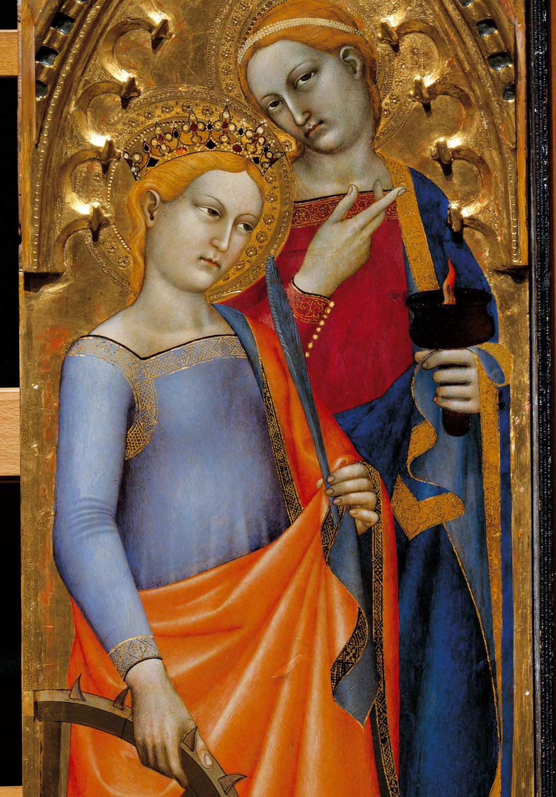 Di questo grandioso polittico che il Vasari vide nel coro della chiesa di Ognissanti, attribuendolo giustamente a Giovanni da Milano (documentato a Firenze e a Roma, dal 1346 al 1369), si conoscono a grandi linee le vicende storiche e conservative grazie all’avvincente ‘inchiesta’ condotta da Mina Gregori nel 1972. Smembrato nel corso dei secoli, sappiamo che la tavola centrale con l’Incoronazione della Vergine, arrivata fino a noi in stato frammentario, è conservata oggi al Museo Nacional de Bellas Artes di Buenos Aires.