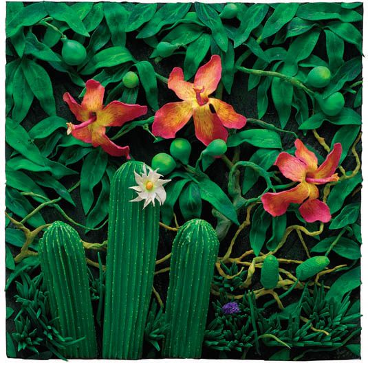 I numerosi Tappeti-natura esposti dalla Galleria MOdenArte presentano una sorta di ricostruzione fedele e meta-reale di frammenti di natura attraverso materiali sintetici come il poliuretano espanso. Il granoturco e le angurie, le pesche e i papaveri, i girasoli, le zucche, ma anche le spiagge, i prati, i giardini, i greti di fiumi, i paesaggi estivi e quelli invernali sono restituiti a una fruizione-contemplazione coerente con l’immaginario tecnologico del mondo contemporaneo. Si crea così un contatto fisico con la realtà attraverso le cose che la compongono e grazie all’utilizzo completo degli organi sensoriali.