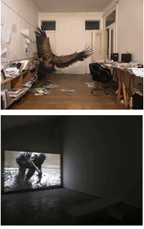 L’assurdo spesso si mostra come una finestra rivelatrice di realtà. Il lavoro di João Onofre, Untitled (Vulture in the studio) sconta proprio questo inesausto confronto, mostrando un insieme abbastanza tranquillo – lo studio dell’artista – e impregnandolo, a poco a poco, di un’irrazionalità che porta lo spettatore ad un ulteriore livello d’interpretazione. In un primo momento non vediamo nulla, solo uno studio vuoto, innocuo nelle proprie implicazioni. Lentamente s’infiltrano nello spazio suoni di passi che si trascinano come graffiando il pavimento. L’attesa di un “essere umano” viene inaspettatamente frustrata dall’apparizione di un enorme avvoltoio. L’animale sembra prendere tempo ad esaminare i dettagli dello spazio, saltando goffamente da una parte all’altra dello studio. L’immagine sconvolgente di quest’animale ci ricorda in fondo che anche noi non siamo altro che intermediari tra l’ordinato e il caotico e che, nonostante i nostri sforzi, ci troviamo costantemente esposti a ciò che ci sfugge e di cui non si ha controllo alcuno.