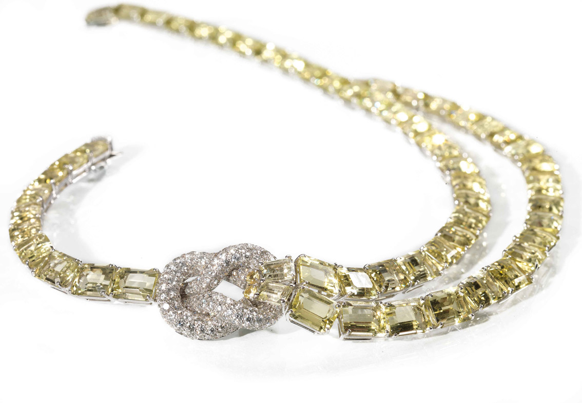 Fra i gioielli di produzione attuale, ci soffermiamo su una collana di Cusi, marchio storico dell’oreficeria italiana, realizzata in oro bianco, diamanti e quarzi citrini nella quale si coniugano tradizione e attenzione per le nuove tendenze: il motivo decorativo del doppio nodo presente in questo gioiello è infatti un leit motif della Maison orafa milanese, attinto dagli archivi dei bozzetti preparatori. Su questo gioiello viene declinato in oro bianco con pavè di brillanti per 7 ct circa ed inserito come collegamento fra linee di quarzi citrini di taglio rettangolare scantonato, montati a griffe in oro bianco, secondo le tendenze dell’alta gioielleria del momento in cui sempre più spesso le pietre semipreziose, di grandi dimensioni, sono preferite rispetto a pietre di maggior valore, anche grazie alla varietà di nuance cromatiche che esse offrono (stima 16.000/18.000 euro). Lo stesso impiego di pietre di colore, dure e semipreziose, si ritrova in una collana Bulgari, nella quale una linea di anelli in quarzo rutilato, malachite, agata striata e ametista sono montati in oro giallo ed uniti da maglie anch’esse in oro giallo (stima 3.500/4.500 euro). Fra i gioielli dell’ottocento, segnaliamo una demi-parure della fine del XIX secolo in micromosaico, composta di collana e paio di orecchini pendenti, entro astuccio d’epoca, ciascuno realizzato con formelle ovali, formate da minutissime tessere vitree policrome disposte a raffigurare volatili di specie diverse e cestini di fiori (stima 3.000/5.000 euro). Per i gioielli di inizio secolo, spicca una spilla anni ’30, in platino e diamanti, per circa 20 carati, modellata come un nastro avvolto su sé stesso con frange pendenti (stima 8.000/10.000 euro) ed un paio di orecchini pendenti, anni ’20, in oro bianco, diamanti e cristallo di rocca, formati da una linea di maglie geometriche traforate, decorate in brillanti, di taglio vecchio, alla cui estremità è sospeso un cristallo di rocca satinato, entro cui è montato un altro brillante di taglio vecchio (stima 7.000/9.000 euro).
