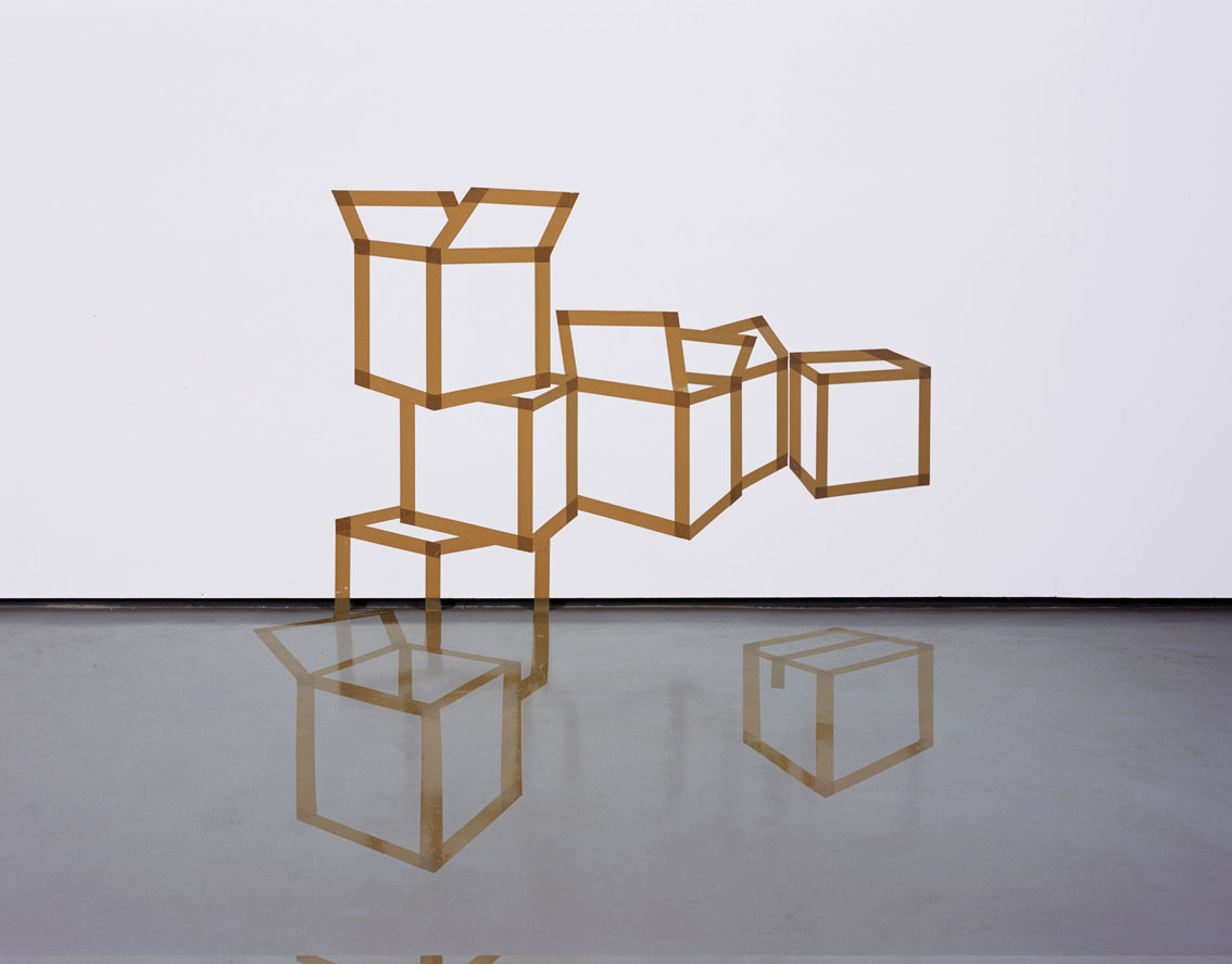 In Made In:side a Villa Bardini, Eškinja presenta una nuova installazione realizzata con lo scoth da pacchi e una serie di fotografie che raffigurano installazioni simili, costruite con lo stesso mezzo in studio o nello spazio della galleria e successivamente distrutte. Quello che rimane è dunque la fotografia, documento e opera al tempo stesso. L’artista usa, come in altri suoi lavori, materiali d’uso quotidiano, il banale nastro adesivo è lo strumento con cui disegnare sagome di scatole sulle pareti e sul pavimento sottostante, con lo scotch definisce i contorni e dà forma al vuoto. L’immagine acquista riconoscibilità e volume solo guardandola da dove è stata fotografata, grazie al sottile artificio dell’anamorfosi: l’unico punto prospettico possibile per distiguerne la forma è quello in cui viene scattata lo fotografia. Eškinja gioca sullo spaesamento, sul confine tra reale e non reale, ti pone sul limen dell’illusione. Ed è qui che entra in scena lo spettatore, vero protagonista dell’operazione, che ha il ruolo di colmare questo vuoto tra finzione e realtà, gli elementi si attivano e prendono corpo grazie alla sua percezione, acquistando nonostante la bidimensionalità della riproduzione fotografica, uno spessore tangibile.