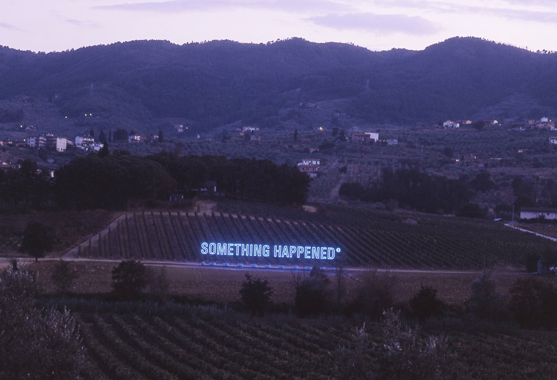 La scritta al neon blu “Something happened”, quaranta metri per tre, si colloca sulla collina di Montalbano di fronte a Villa La Màgia, ben visibile dal suo giardino all’italiana. L’opera si confronta con lo spazio, fisico e allegorico, del territorio, evidenziandone l’entità e il valore del suo passato. Ma il forte impatto, generato dalla luce, dal colore e dal significato della scritta del neon, introduce un nuovo elemento significante che anima il luogo di una nuova energia, intervenendo sul contesto e sull’immagine stessa del paesaggio. Nannucci crea, attraverso l’uso dello spazio come strumento linguistico, una relazione con lo spettatore e lo conduce a vivere soggettivamente l’intervento ambientale, fornendo un nuovo sistema di significati sui quali riflettere. Così come gli altri statements dell’artista, “Something happened” racchiude un forte contenuto emotivo, capace di influenzare stati d’animo interiori e punti di vista.