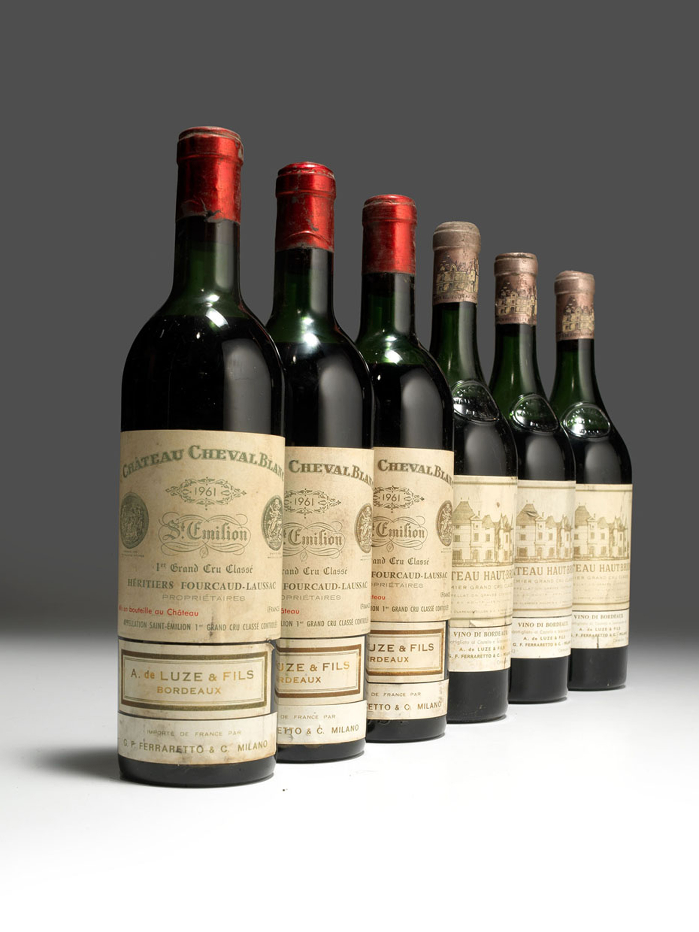 Le storiche etichette di Bordeaux sono tutte presenti in gran quantità. Citiamo, per l’unicità determinata dall’annata storica, due lotti in particolare: quello composto da 6 bottiglie di Chateux Cheval Blanc 1961, stimate 4.000/6.000 Euro e quello costituito da 6 bottiglie di Chateau Haut Brion sempre 1961, stimato 3.000/5.000 Euro (foto 6506).