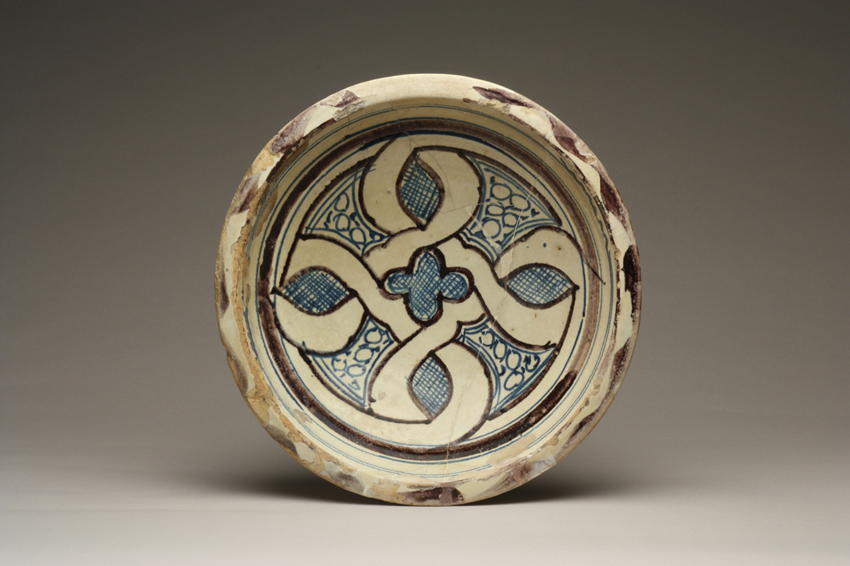 Fig. 01 – Bacino con decorazione in colbato e manganese, produzione Tunisina (1165‐1220). Originariamente murato sulla facciata della Cattedrale di Santa Maria a San Miniato, oggi conservato presso il Museo Diocesano. Decorazioni con motivi geometrici intrecciati.