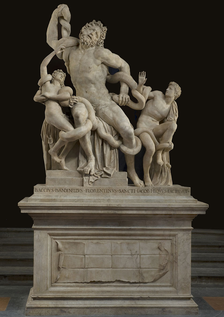 Come sappiamo, Baccio Bandinelli ricevette l’incarico nel 1520, dalla corte pontificia, di realizzare per Francesco I di Francia, una copia dell’originale ellenistico scoperto a Roma sul Colle Oppio, presso le Terme di Tito, il 14 gennaio del 1506. L’opera raffigurava il sacerdote troiano che, secondo il racconto di Virgilio, si era opposto all’ingresso a Troia del cavallo di legno lasciato dai Greci di fronte alla città suscitando le ire di Atena e Poseidone. Due serpenti marini lo avvolsero fra le loro spire, uccidendolo insieme ai due figli, e segnando così la distruzione di Troia.