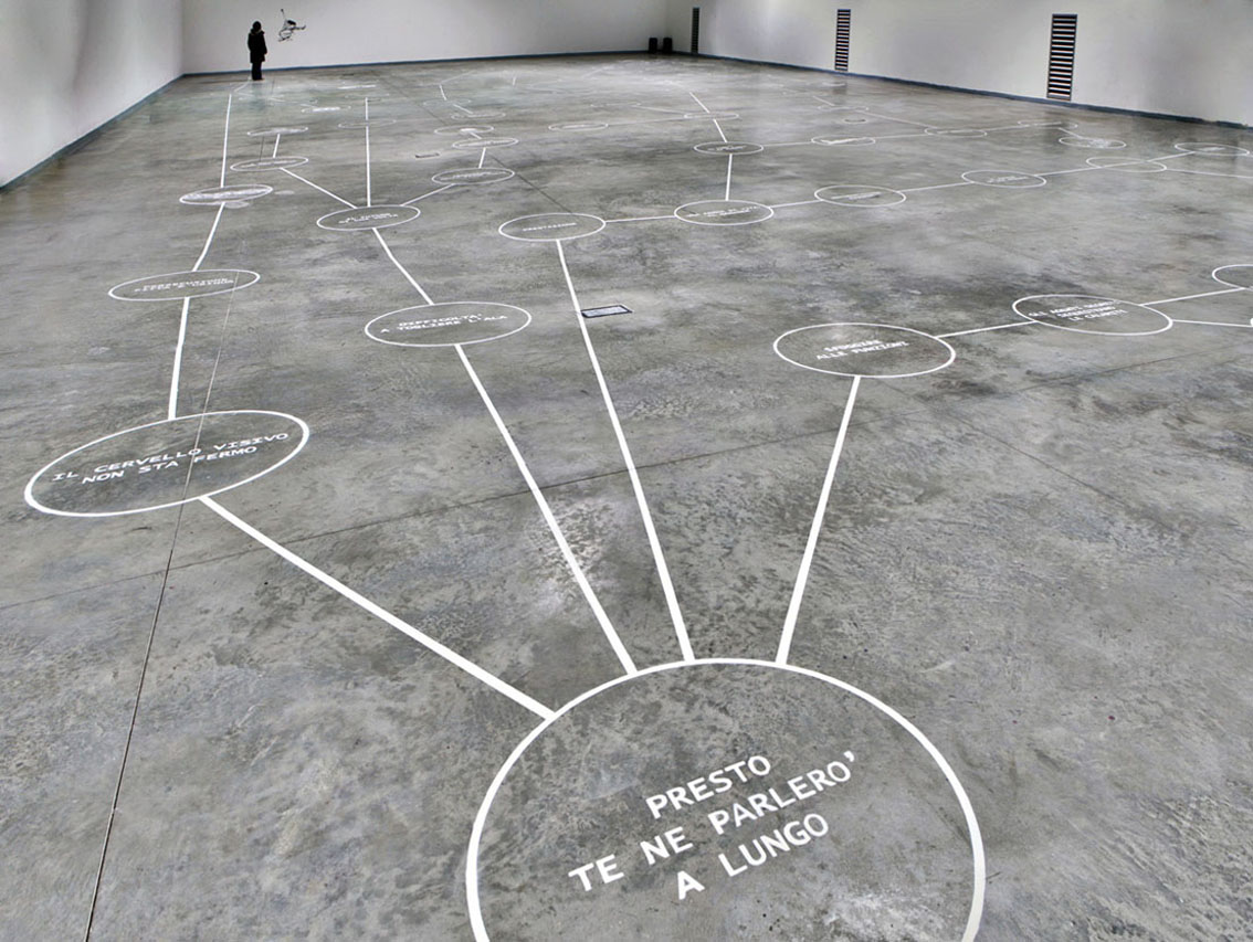 In questa direzione si sviluppa grigio nonlineare, il progetto site-specific che l’artista ha elaborato per la sala centrale di EX3, alla cui origine possiamo rintracciare un invito ai visitatori dello spazio. Si tratta un intervento a terra, concepito come una sorta di diagramma, un tracciato percorribile che si sviluppa sull’intera superficie del pavimento attraverso 64 frasi e 16 disegni.