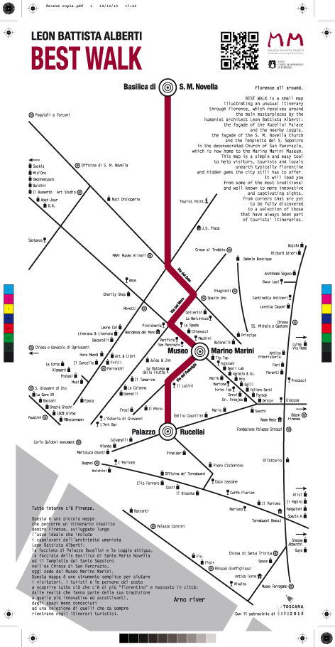 Più che una piccola guida di taglio tradizionale, BEST WALK è un suggerimento di percorso che coniuga arte e qualità in una parte di Firenze, solo apparentemente già nota. Un itinerario insolito che si svolge lungo l’asse ideale che collega i capolavori di Leon Battista Alberti, come la facciata di Palazzo Rucellai e la Loggia attigua, in via della Vigna, la facciata della Basilica di Santa Maria Novella e il Tempietto del Santo Sepolcro, recentemente riaperto al pubblico, dopo il restauro, nell’ex chiesa di San Pancrazio, oggi sede del Museo Marino Marini.