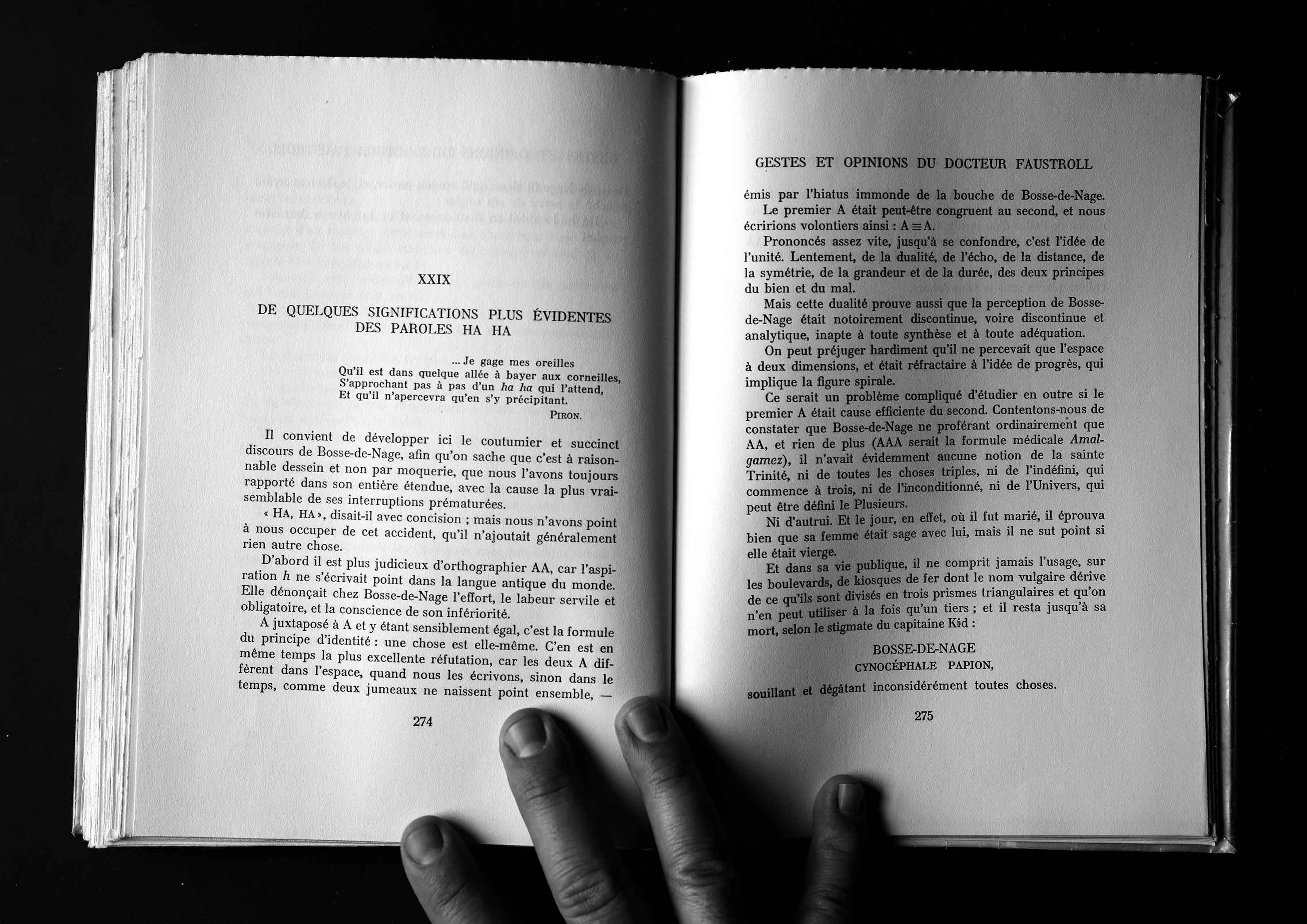 L’artista francese Julien Bismuth invece ha lavorato direttamente sui testi di Jarry, creando dei poster da scansioni e fotografie delle pagine del libro Gesta e opinioni del Dottor Faustroll, Patafisico. I passi selezionati da Bismuth riportano tutti gli episodi in cui Bosse-de-Nage, la scimmia che accompagna Faustroll, esclama ’HA ’HA, le uniche parole che il babbuino è in grado di pronunciare. Nel corso del libro la continua ripetizione in ogni capitolo dell’espressione ‘HA ‘HA diventa una linea di riferimento per il lettore e uno strumento linguistico che in realtà nasconde molteplici significati simbolici. Queste immagini saranno esposte al Museo Marino Marini, all’Institut français di Firenze e in vari altri luoghi della città selezionati dall’artista. Essendo privi di qualsiasi riferimento alla mostra o al titolo del libro, questi poster acquistano una presenza enigmatica nello spazio pubblico dove solitamente siamo abituati ad avere tutte le informazioni necessarie per comprendere le immagini che ci circondano.