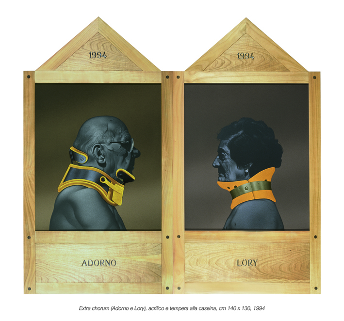 Gli stessi assemblaggi dei polittici esposti – 28 in tutto, alcuni dei quali inediti – con le loro architetture di contenimento e le relative sintonie strutturali (ancone, scomparti, lunette, cuspidi e predelle), riaffermano le relazioni e le consonanze con la tradizione pittorica trecentesca e rinascimentale che, al di là dei contrassegni di una sacralità finalizzata al culto, impongono una riflessione sugli sviluppi della figurazione dell’arte contemporanea e delle mutazioni concettuali-linguistiche trasferite, senza nostalgie anacronistiche, in un contesto laico-storico ben definito dalle contingenze esistenziali del nostro perimetro quotidiano.