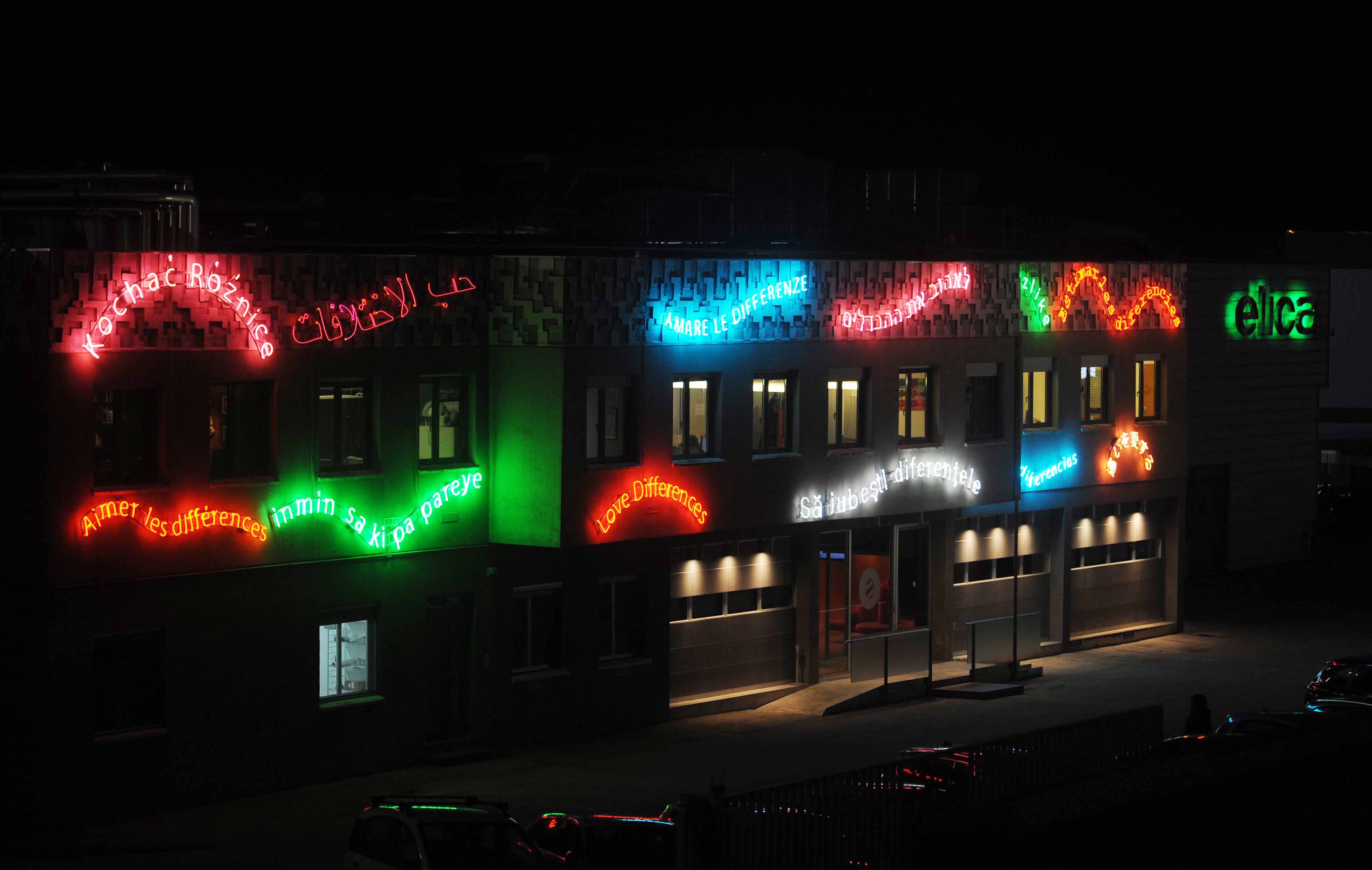 Sulla facciata dell’headquarter di Elica a Fabriano un inedito allestimento dei neon di Love Difference, nati da un’idea di Michelangelo Pistoletto per valorizzare le differenze.