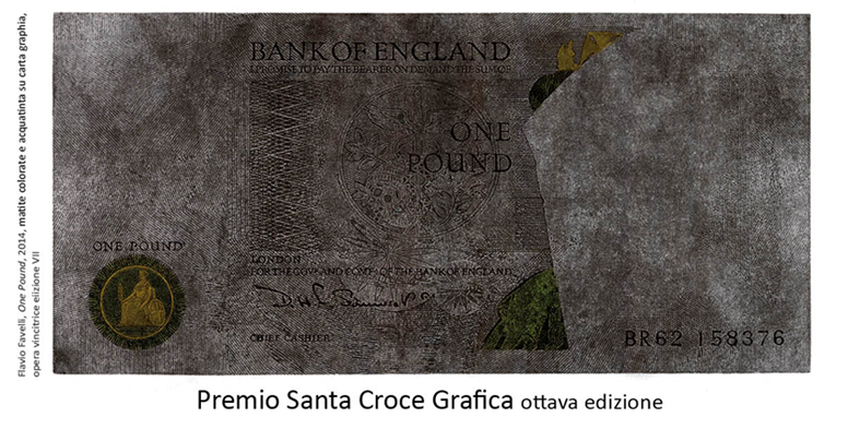 La scorsa edizione, sempre curata da Ilaria Mariotti, è stata vinta da One Pound, opera di Flavio Favelli, realizzata con matite colorate e acquatinta su carta graphia. Si trattava, secondo le parole dell’artista, di “una copia di banconota da una sterlina emessa dalla Banca d’Inghilterra, della serie in circolazione dal 1982. La particolarità di questa banconota numero BR62158376 è un errore, per il quale, evidentemente, un foglio si è sovrapposto alla cartamoneta nel momento della stampa, creando una zona senza colore proprio sul viso della Regina Elisabetta II. Una delle immagini più dense che ho incontrato e che hanno senz’altro segnato la mia visione d’artista – racconta Favelli – è la copertina del disco God save the Queen del gruppo musicale Sex Pistols del 1977, dove gli occhi e la bocca della Regina sono censurati dalle scritte”.