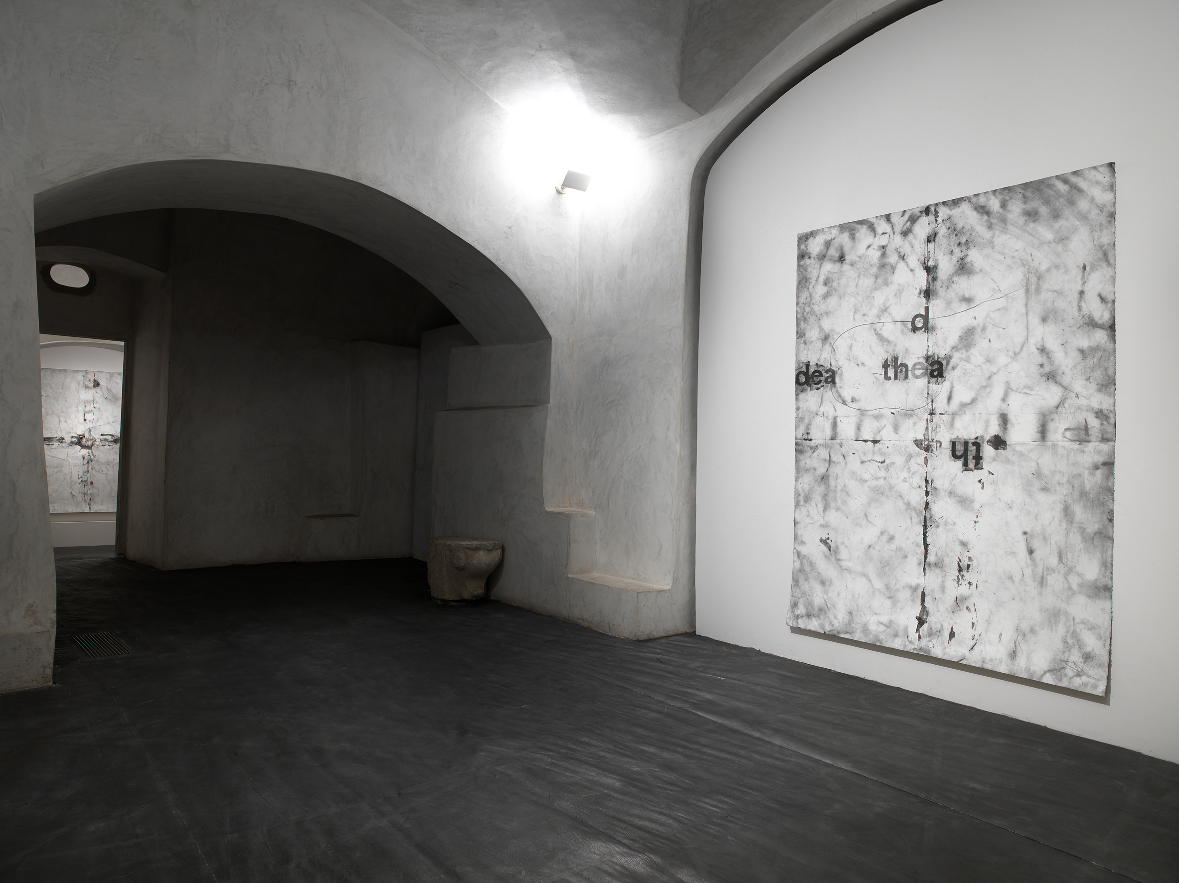 Alle pareti di alcuni ambienti della cripta compaiono dei disegni; in essi la parola viene destrutturata e il valore semantico e segnico delle lettere assume una autonomia rispetto alla composizione. La parola scelta è legata ad un rimando, ad un’evocazione personale, ad una sensazione rispetto al luogo: lo spazio espositivo del Museo Marini un tempo la cripta di una chiesa – per mille anni luogo di sepoltura dei frati del convento di San Pancrazio – luogo di passaggio dalla vita terrena a quella celeste, oggi luogo di creazione e di resistenza, la stessa che nelle parole delle opere dell’artista si può sentire e che non può variare. Il rapporto non risolto tra superficie e spazio oltre il piano, posto tra la fisicità dell’immagine e il suo costituire confine e barriera, ha nella scrittura una presentazione mai risolta, rinnovando ogni volta nuove questioni che l’immagine pone.
