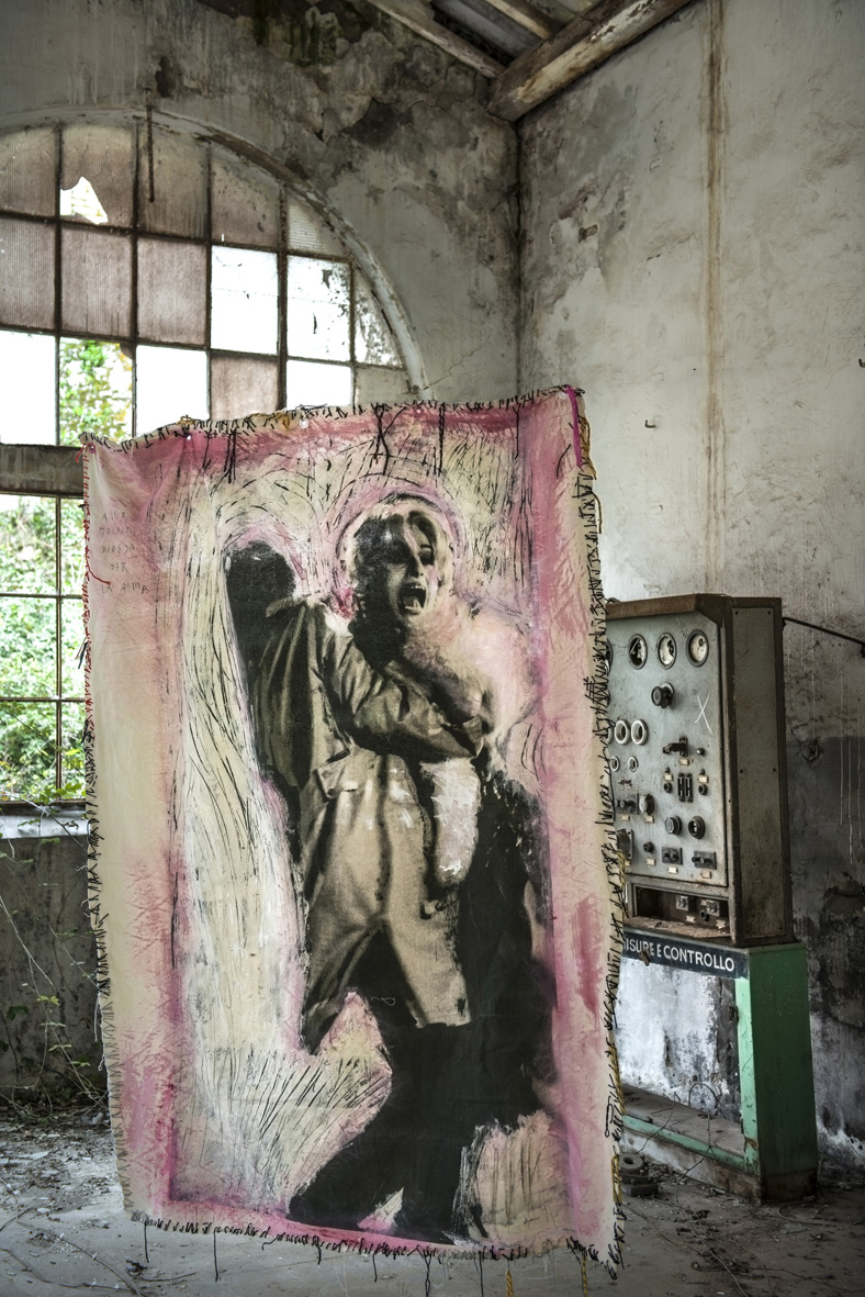 Alla GAMC di Viareggio i due artisti scelgono di raccontare il cinema italiano attraverso le arti. Le foto di scena dei set di Monicelli si trasformano in teli dipinti, graffiati, ricamati, fotografati in un’archeologia industriale, per tornare, come in un gioco dell’oca, al filmato proiettato sul muro del museo. Dai tessuti di cotone, un giovane Mario Monicelli sorride, giocando con i suoi cappelli. Intorno, leggeri, fluttuanti, i volti di Totò, Anna Magnani, Gassman e Mastroianni. L’unione tra architettura, cinema, pittura e fotografia sembrano magicamente ritrovare un unico filo conduttore nelle immagini di Andrea Vierucci che ha raccolto con grande coinvolgimento emotivo oltre che professionale il lavoro di Chiara Rapaccini.