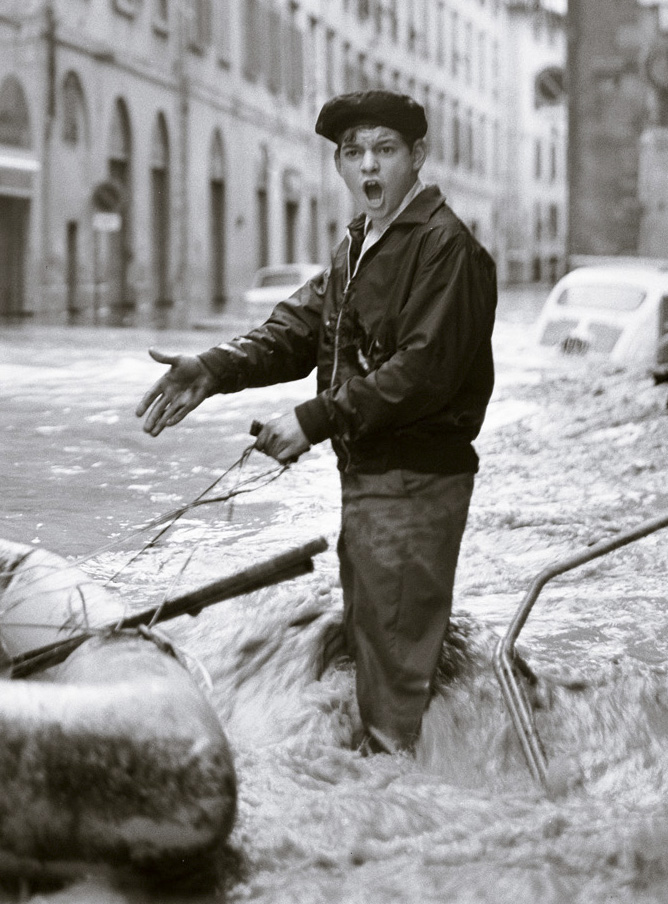 Ha l’acqua al ginocchio, il ragazzo di questa foto, e la corrente gli sta rovesciando addosso oggetti di ogni tipo, mentre armeggia con un canotto. È il 4 novembre del 1966, l’Arno ha rotto gli argini da poche ore e le strade sono state travolte dalla piena.