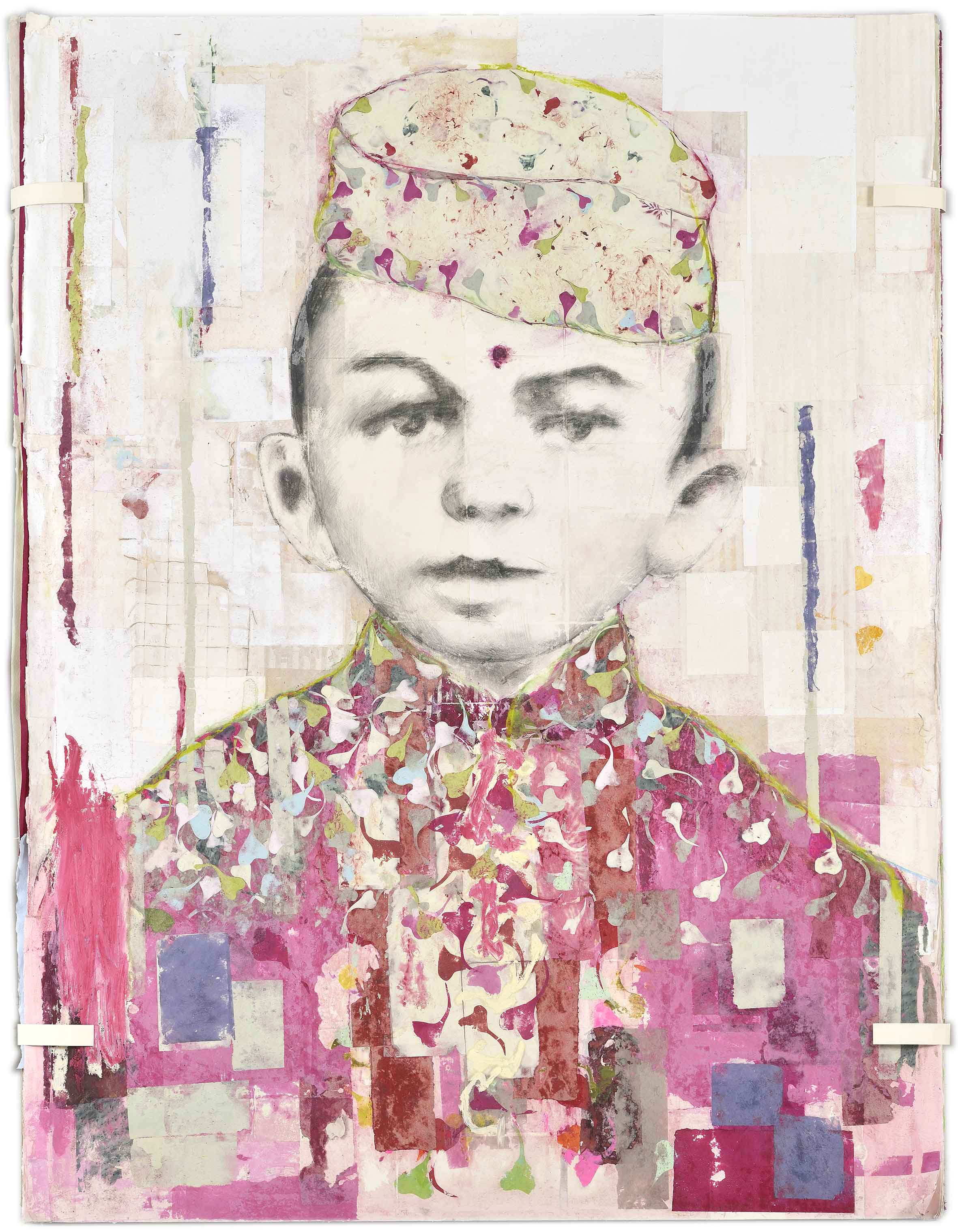 Un aspetto fondamentale di queste opere è la tecnica. L’artista inizia con la preparazione di un pannello di legno di grandi dimensioni (180×120 o 210×150 cm, occasionalmente di dimensioni inferiori) che ricopre con carta da disegno, utilizzando tonalità che vanno dal bianco al bianco sporco. Inizia con un disegno elaborato, una fase che può richiedere anche svariati giorni, e crea una silhouette usando carte colorate. Applica sul dipinto diversi strati di strisce di carta, a volte di tessuto, letteralmente ‘stirate’ sopra la superficie. Così riesce ad ottenere uno spessore fortemente tattile, quasi scultoreo, che crea effetti di grande profondità. Costruisce poi in maniera meticolosa macchie, linee e sabbiature intorno al personaggio. Esplora tutta la gamma di elementi da disporre e ridisporre sulla superficie per poterli fissare nel tempo e nello spazio. Ha un archivio enorme, ottenuto passando al setaccio biblioteche, archivi fotografici e siti internet alla ricerca di ritratti giovanili dei soggetti scelti.