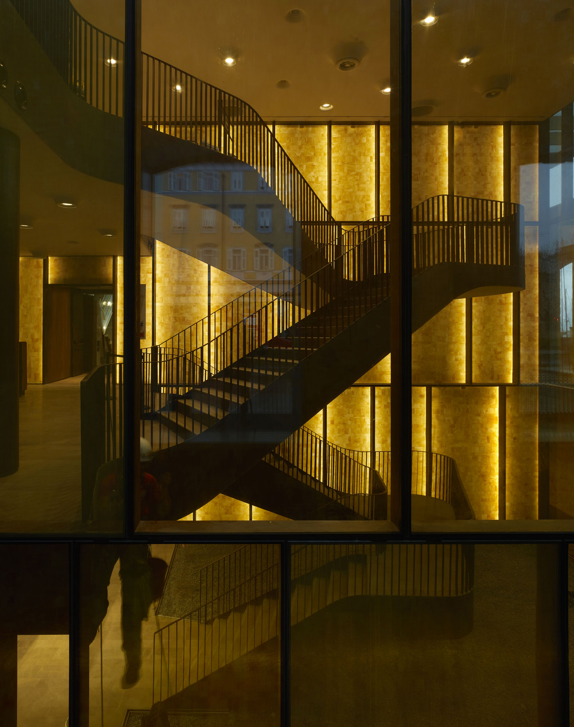L’atrio dell’edificio, tale un vero e proprio foyer teatrale, è caratterizzato da un’imponente doppia scala monumentale in acciaio cor-ten – che collega i tre piani commerciali, alla base della quale sono situate due vasche d’acqua altamente scenografiche – e da una grande parete rivestita in mattonelle di vetro retroilluminate che richiamano, per forma e materiale, il rivestimento interno delle antiche vasche dove veniva conservato il vino.